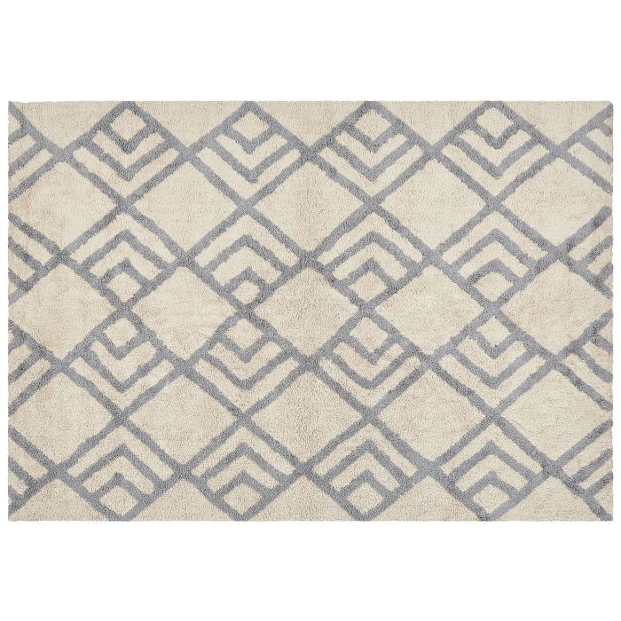 Cosy up your living room with this light beige rug. It features a pleasant to eye geometric pattern in grey that will make the rug stand out among other accessories. Hand tufted from cotton, it is exceptionally soft and durable. Put it either under your sofa or bed to give your feet comfort and level up the look of your interior. Details: Color: Beige, Grey. Main material: Cotton. Material Composition: 100% Cotton Weight: 5.1 Assembly: Does Not Require Assembly