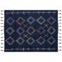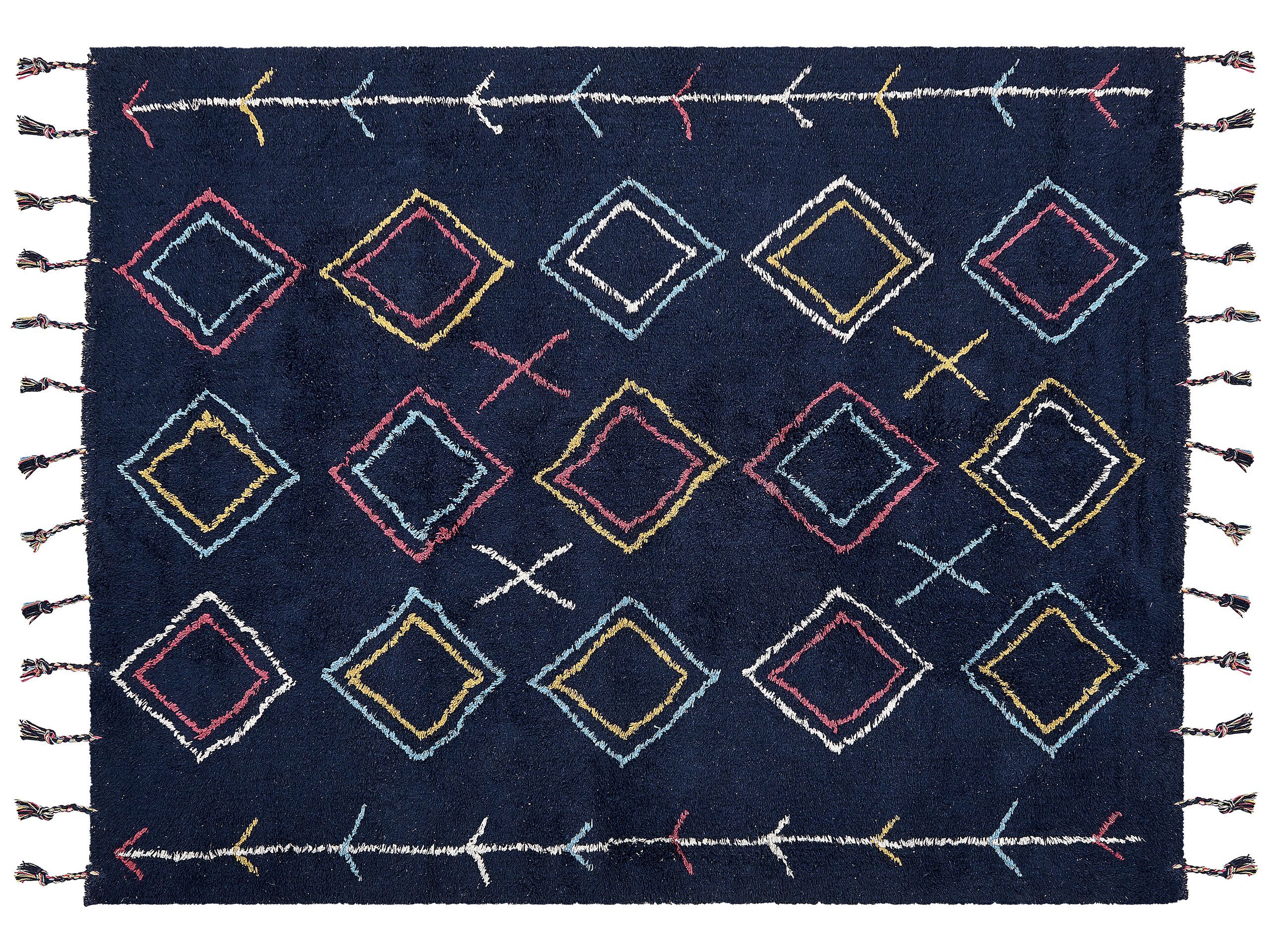 This rug in geometric pattern is a unique piece of décor that will bring a boho vibe to your living room or bedroom. Hand tufted from cotton, it is exceptionally soft and will serve best as a rug under your bed or sofa. The addition of tassels emphasizes the highly decorative style of the rug, while the combination of colours make the item match a variety of designs. Details: Color: Black, Blue, Burgundy, Yellow, White. Main material: Cotton. Material Composition: 100% Cotton Weight: 4.7 Assembly: Does Not Require Assembly