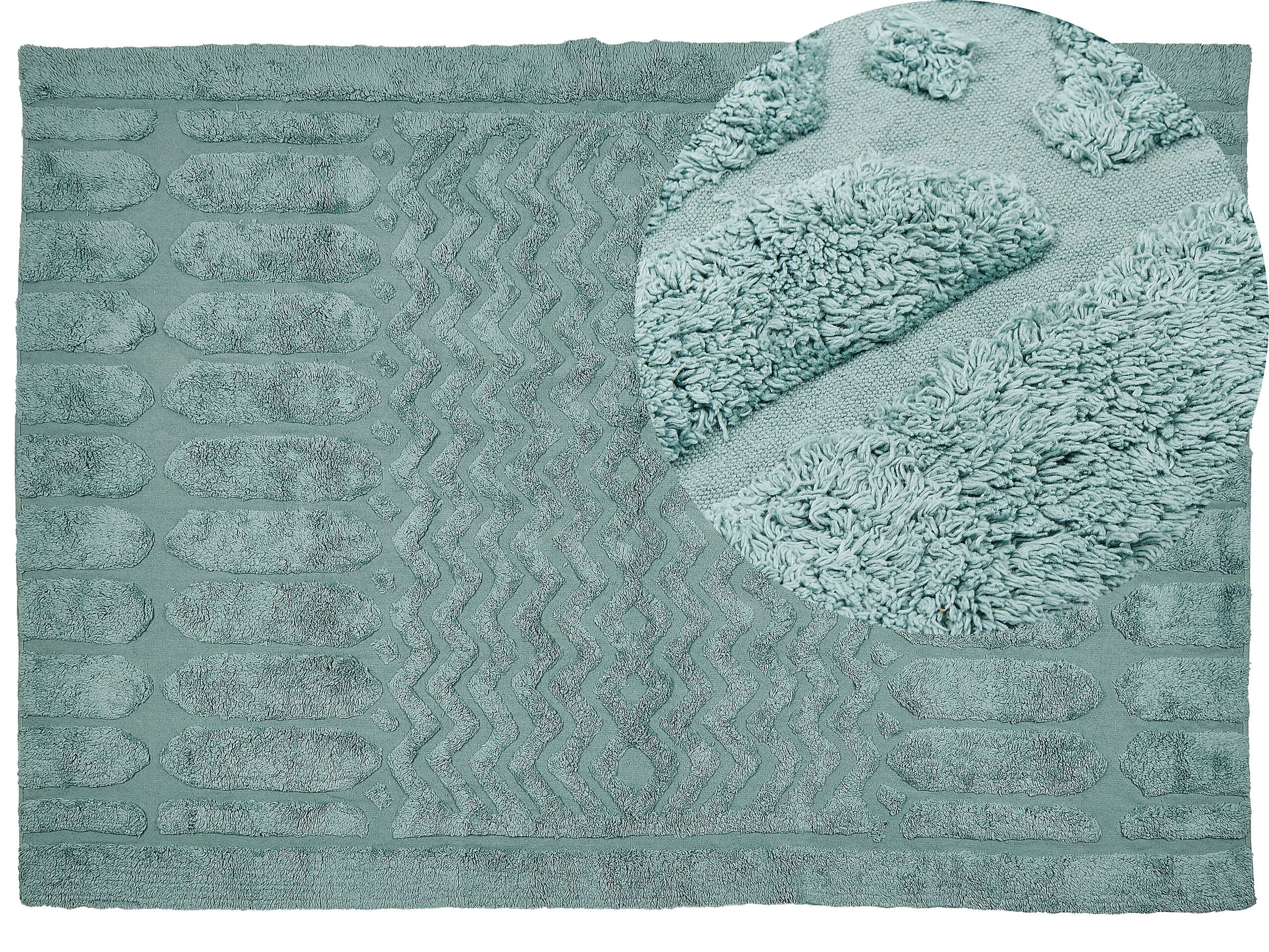 Add a touch of warmth and cosiness to any design with matching accessories. This area rug in a nice mint shade with its shaggy texture and woven geometric pattern is a perfect decoration that will brighten any look. Place it next to your sofa or bed and enjoy the softness of the cotton fibre whenever you step on it. Details: Color: Green. Main material: Cotton. Material Composition: 100% Cotton Weight: 4 Assembly: Does Not Require Assembly