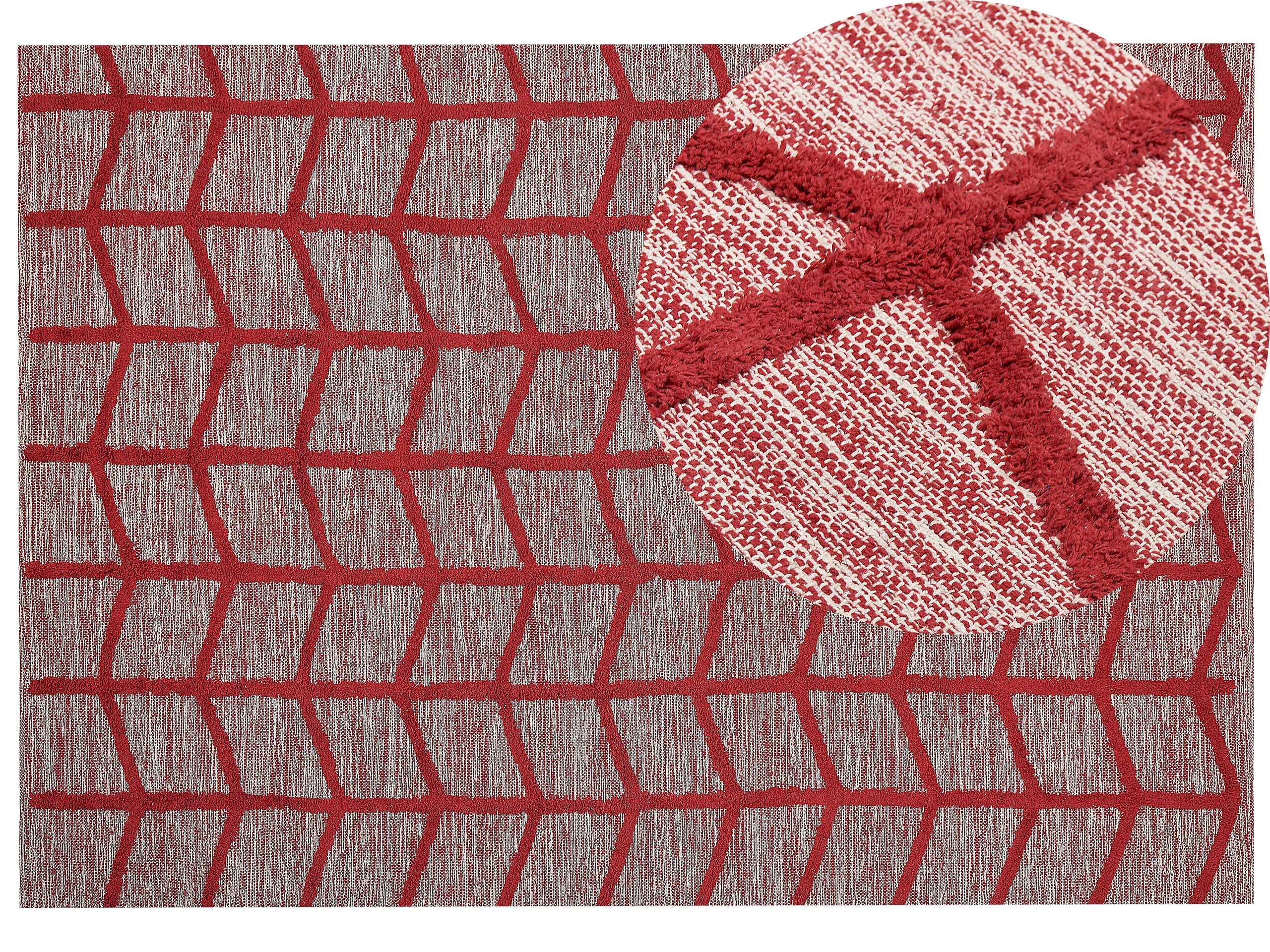 Striking pattern and vivid colour - these are the most important features of this area rug. Besides that, the piece features a pleasant to touch surface, and is quite durable, as it was made out of cotton. Due to its design, it will look the best in modern areas, but can be also matched with boho or retro interiors. Details: Color: Red. Main material: Cotton. Material Composition: 100% Cotton Weight: 4 Assembly: Does Not Require Assembly