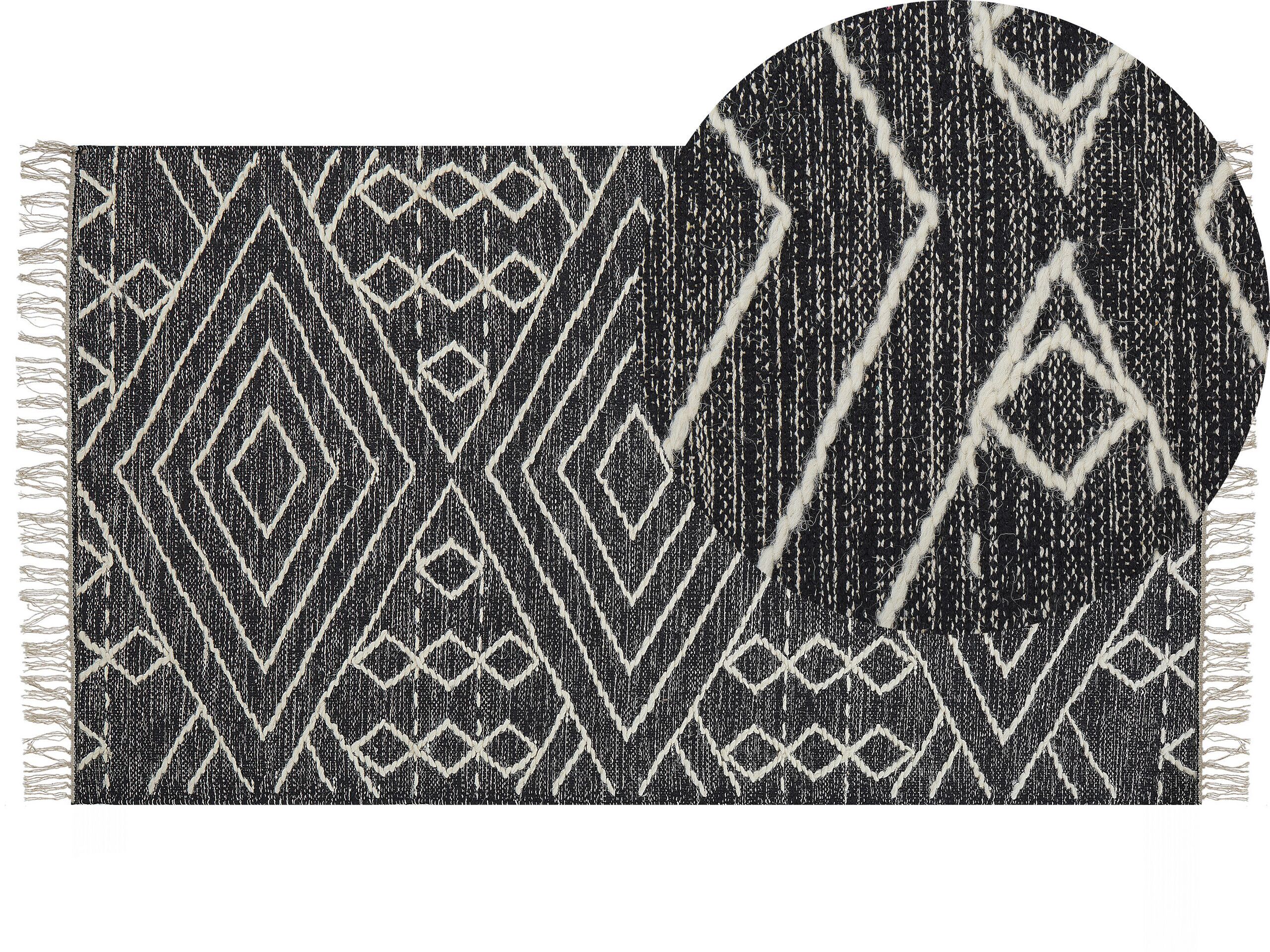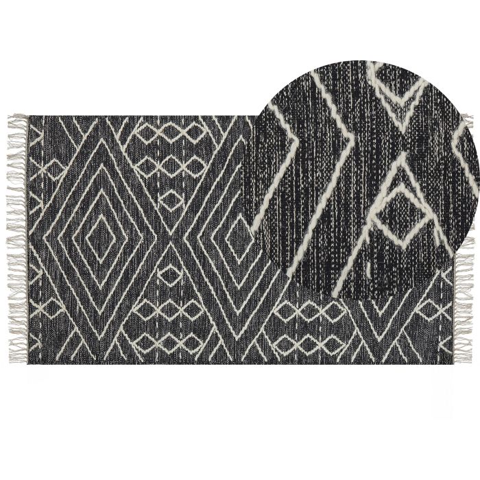 Add an eye-catching accent to your living room or bedroom, which at the same time will create a cosy atmosphere. This handmade rug is crafted from high-quality cotton as well as wool for durability. The geometric pattern and tassels boost the oriental feel of the piece that will nicely work with boho interiors. Details: Color: Black, White. Main material: Cotton. Additional material: Wool. Material Composition: 30% Wool, 70% Cotton Weight: 2 Assembly: Does Not Require Assembly