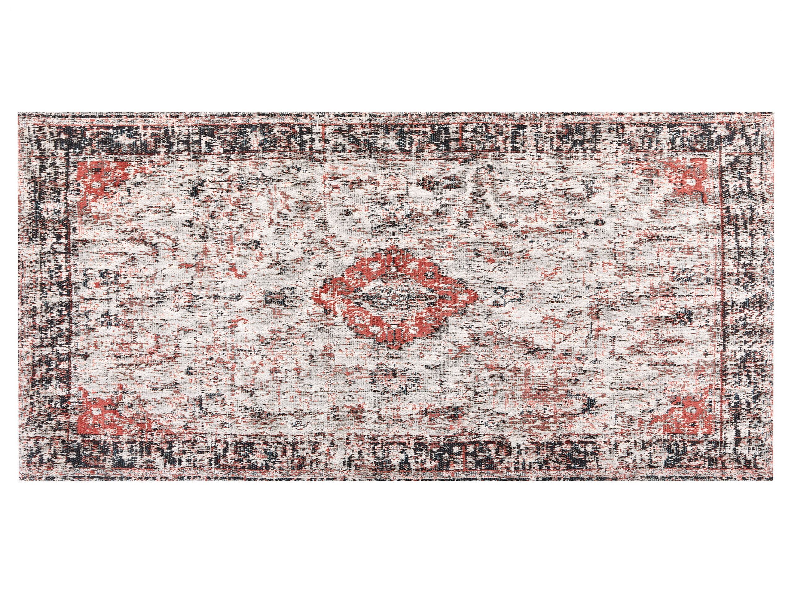 Add this area rug to enhance your living space and make it more cosy. The piece, made out of high-quality cotton and polyester blend, is very pleasant to touch and warm, so you can walk barefoot on it - this makes it a great addition next to your sofa or bed. It features a distressed, oriental-like pattern, which is sure to draw attention - it also makes the rug fit in vintage interiors the best. Thanks to the used material, it doesn't require daily care, therefore can last for many years with ease. Details: Color: Red, Beige, Black. Main material: Cotton. Additional material: Polyester. Material Composition: 70% Cotton, 30% Polyester Weight: 3 Assembly: Does Not Require Assembly