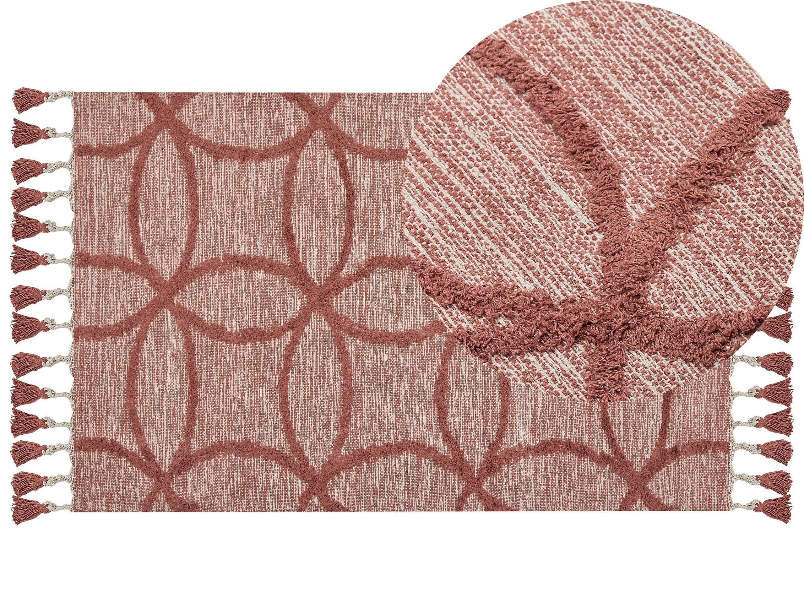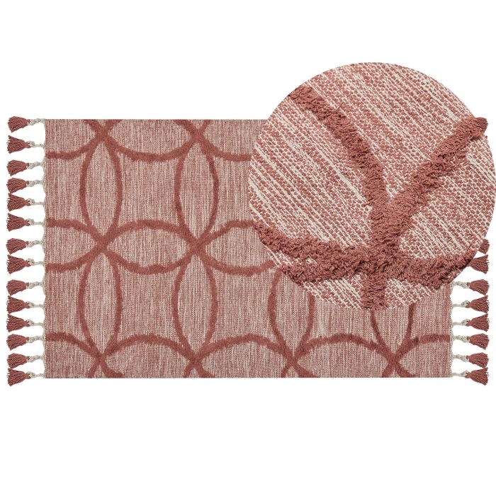 Draw attention to your living room or bedroom decor with this stylish, unique area rug. The piece is hand tufted, which makes every rug from the collection one of a kind. This decoration will surely draw attention thanks to its pattern, as well as tassels in a matching, red colour. The rug is also ideal for traffic heavy areas in your home, as it is made out of durable, pleasant to touch cotton. Details: Color: Red. Main material: Cotton. Material Composition: 100% Cotton Weight: 1 Assembly: Does Not Require Assembly