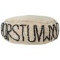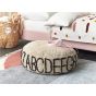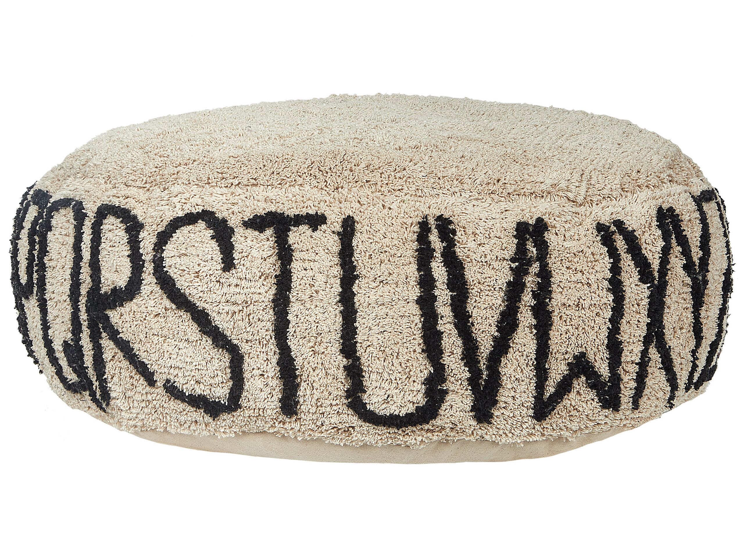 This plush cotton floor cushion is designed for comfort and style. Crafted in a charming round shape and adorned with a soothing beige hue, it seamlessly blends into any living space. Featuring a playful alphabet pattern, it adds a touch of educational fun to any kids' room or play area. Details: Color: Beige, Black. Main material: Cotton. Material Composition: 100% Cotton Weight: 1.6 Assembly: Does Not Require Assembly Weight Capacity: 100