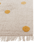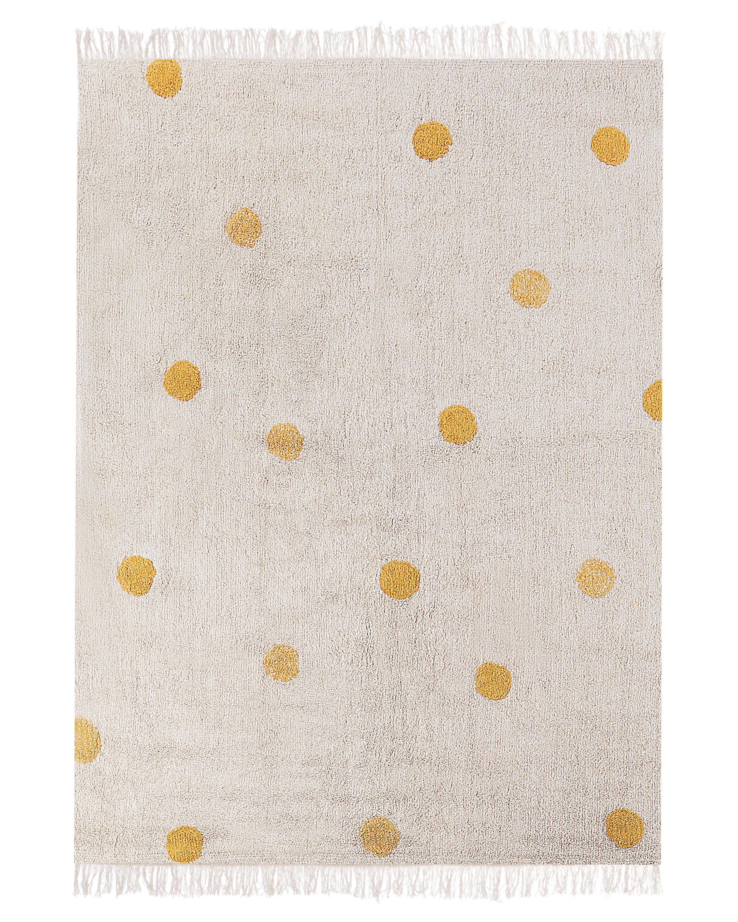 Crafted from the softest cotton for delicate little feet, this charming area rug is a delightful addition to any child's room. It's designed with both comfort and play in mind - the durable cotton ensures it's built to last through every giggle and game. The rug's neutral palette is brought to life with a playful, yellow polka dots pattern, while the fringe detailing on the edges gives a whimsical touch. Details: Color: Beige, Yellow. Main material: Cotton. Material Composition: 100% Cotton Weight: 2.8 Assembly: Does Not Require Assembly