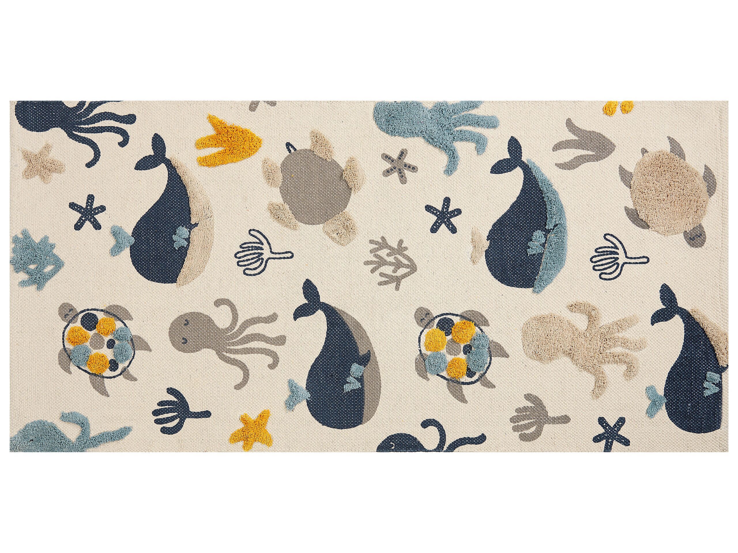 Introduce a sense of adventure and imagination to your child's room with our enchanting underwater animal-patterned rug. Handwoven with care, this cotton unique piece is soft, durable and high-quality. Its versatile colouring effortlessly complements any decor scheme while adding a touch of cosiness and playful accents. Additionally, it is safe in usage thanks to the sprayed back, so the product won't slip. Details: Color: Multicolour, Beige, Blue, Grey. Main material: Cotton. Additional material: Polyester. Material Composition: 95% Cotton, 5% Polyester Weight: 1.5 Assembly: Does Not Require Assembly
