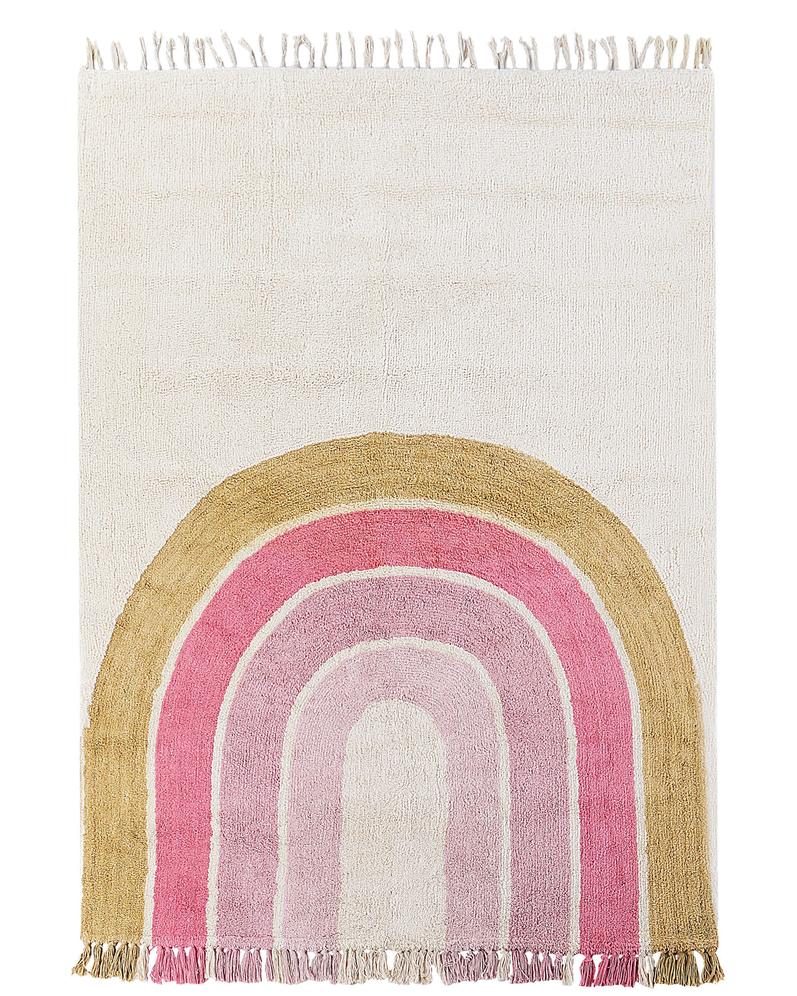 This area rug will revitalize your little one's room, infusing it with a colourful and playful vibe. Crafted by hand from durable cotton, it's not only soft and inviting to the touch but also an ideal spot for playtime. Adorned with an eye-catching rainbow pattern and decorative tassels in coordinating hues, this rug promises to be a charming and vibrant addition to any child's space. Details: Color: Beige, Pink, Yellow. Main material: Cotton. Material Composition: 100% Cotton Weight: 2 Assembly: Does Not Require Assembly