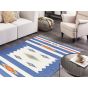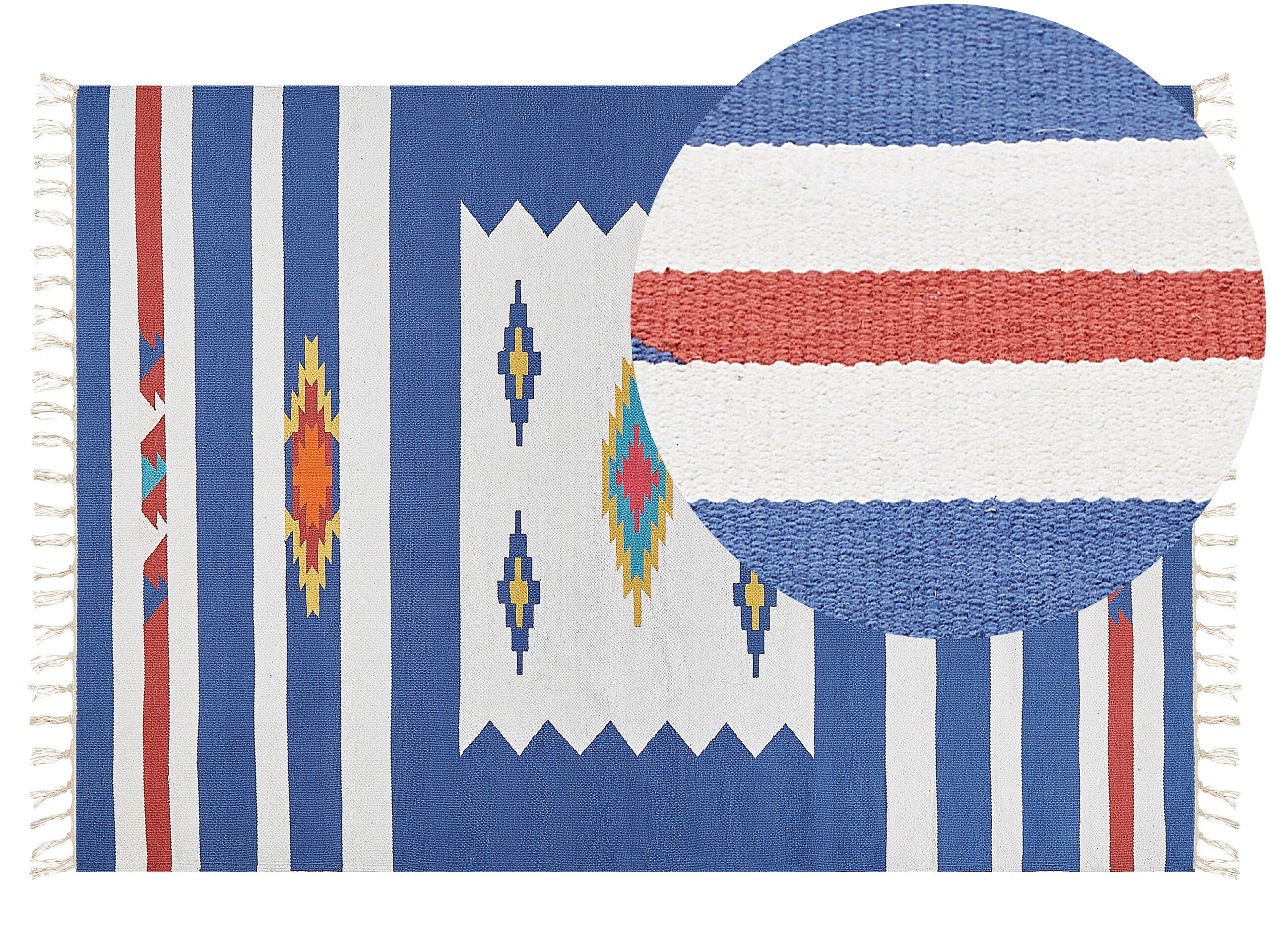 Add the perfect accent to your home with this unique handcrafted kilim rug, made of cotton. Its striking geometric pattern, in blue and white, is accented with touches of red for an eye-catching look. Tassels on the edges and a reversible design make the rug a versatile addition to any room. Details: Color: Multicolour, Blue, White, Red. Main material: Cotton. Material Composition: 100% Cotton Weight: 3 Assembly: Does Not Require Assembly