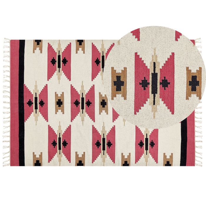 Unleash the allure of tradition with this captivating handwoven kilim rug. Embodying the essence of oriental artistry, its intricate patterns in shades of red and beige will feel any space with warmth. Crafted with love and expertise, this rug is a harmonious fusion of old-world charm and modern practicality. Embrace the playful tassels on both ends that add a touch of whimsy to your space. And when it's time to refresh, simply toss it in the machine and relish its long-lasting beauty. Transform your home into an enchanting sanctuary where tradition meets innovation with this stunning kilim rug. Details: Color: Multicolour, Red, Beige, Black. Main material: Cotton. Material Composition: 100% Cotton Weight: 2.3 Assembly: Does Not Require Assembly