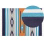 Bring bold colours and eye-catching design to your home with this handmade rectangular kilim rug. Made of cotton, it features geometric pattern and tassels, adding a stylish look to any interior. The rug is reversible and washable, so there is no need to worry about its maintenance. Details: Color: Multicolour, Blue, Grey, Orange. Main material: Cotton. Material Composition: 100% Cotton Weight: 6 Assembly: Does Not Require Assembly