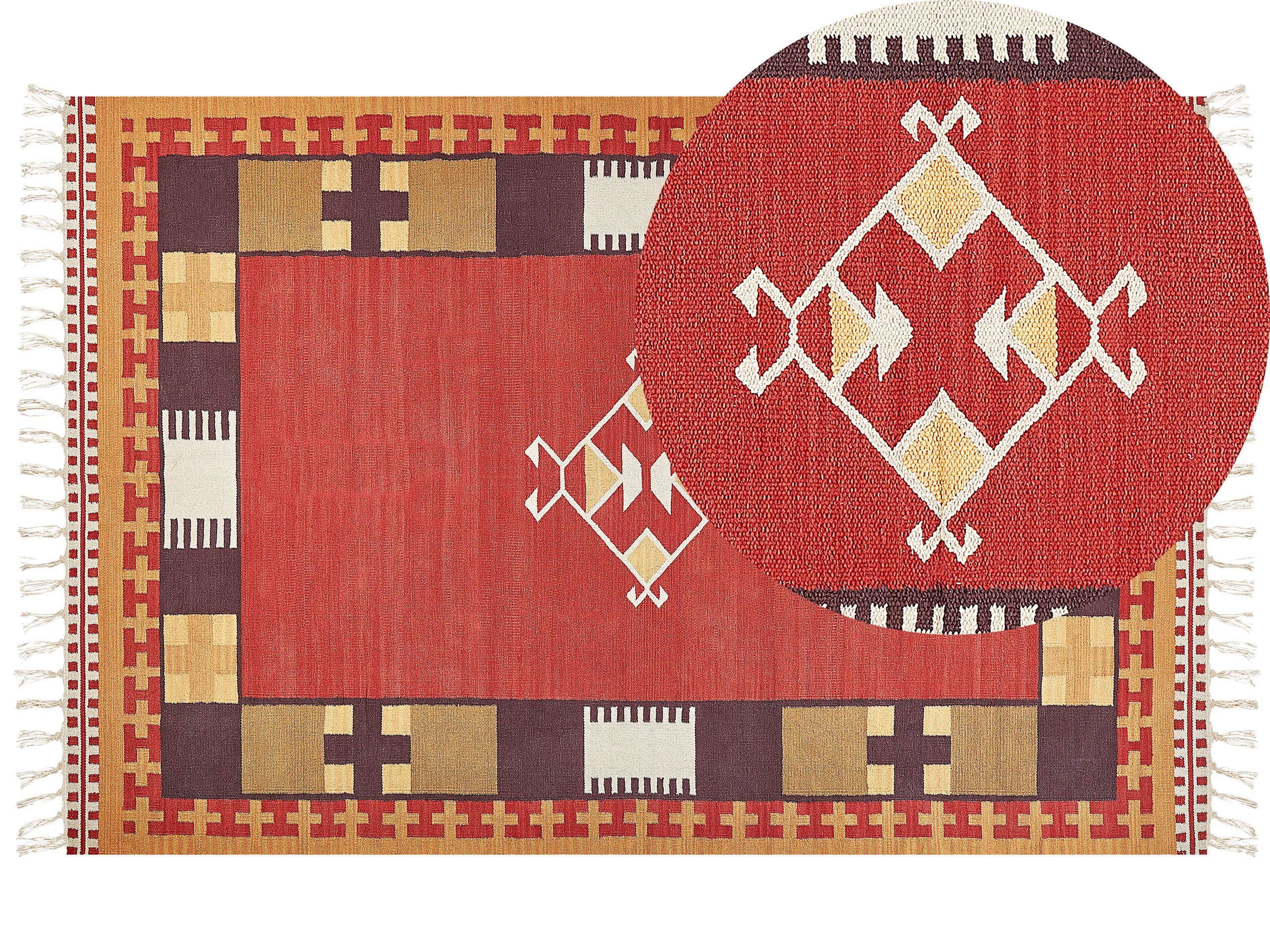 Immerse yourself in the cultural tapestry of a handwoven kilim rug. Crafted with artistry and love, its intricate patterns in mesmerizing shades of red and brown makes for a nice statement piece. Feel the delightful tassels underfoot, adding a touch of bohemian charm to your space. And when life gets messy, rest easy knowing this rug is machine washable, ensuring effortless maintenance and lasting allure. Elevate your home with this captivating kilim rug that blends heritage with modern convenience, creating a unique sanctuary that truly reflects your spirit. Details: Color: Multicolour, Red, Brown, Beige. Main material: Cotton. Material Composition: 100% Cotton Weight: 6.1 Assembly: Does Not Require Assembly