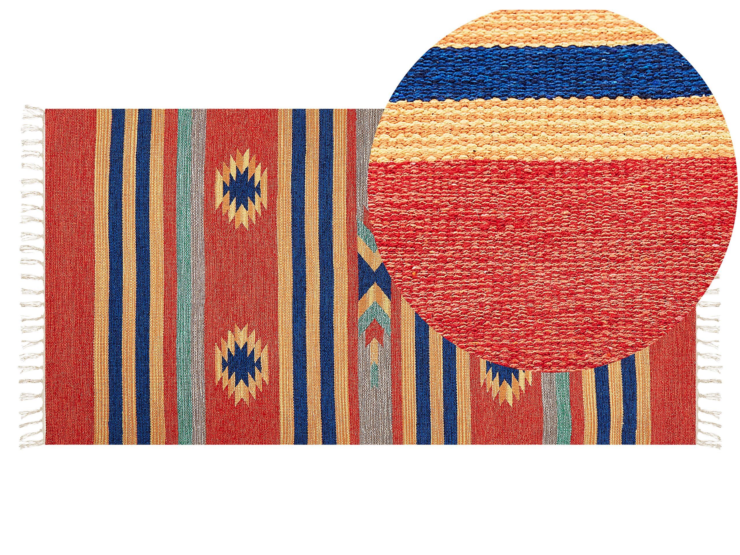 Bring your space to life with this bold rectangular kilim rug with tassels. Crafted in cotton and handmade for a unique look, it features a geometric pattern in vibrant colours. The rug is reversible and washable for easy maintenance. Details: Color: Multicolour, Blue, Red, Orange. Main material: Cotton. Material Composition: 100% Cotton Weight: 1 Assembly: Does Not Require Assembly