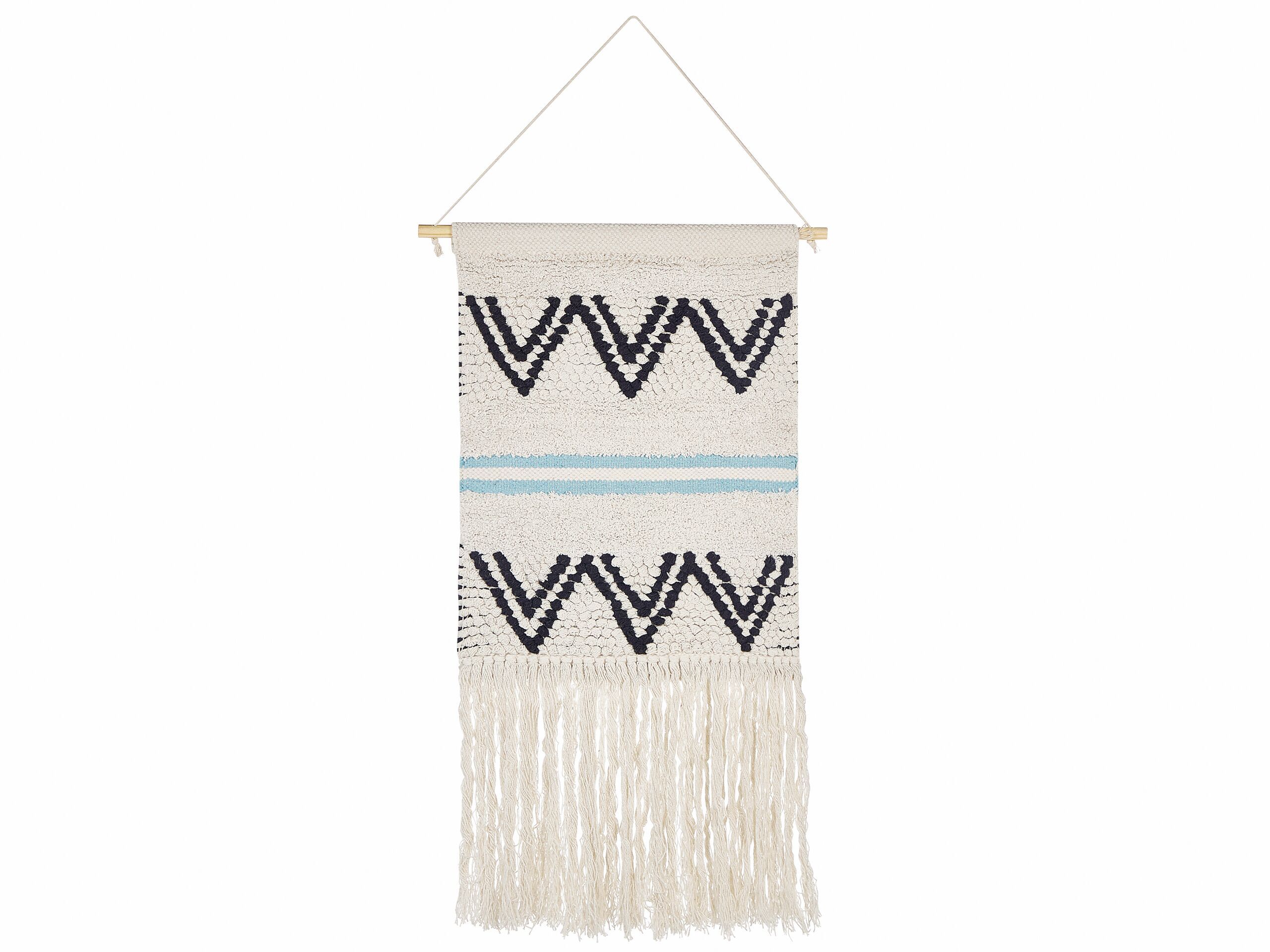 Give your interior a unique, cosy character thanks to this beautiful decoration to hang on the wall. Its geometric pattern, decorative fringes and light blue accent will add a boho feel to any space. The product is made with the highest precision, from cotton fiber, which guarantees the durability of the product. Details: Color: Black, Beige, Blue. Main material: Cotton. Additional material: Eucalyptus Wood. Weight: 0.7 Assembly: Does Not Require Assembly Wood type: Eucalyptus grandis Wood Origin: China