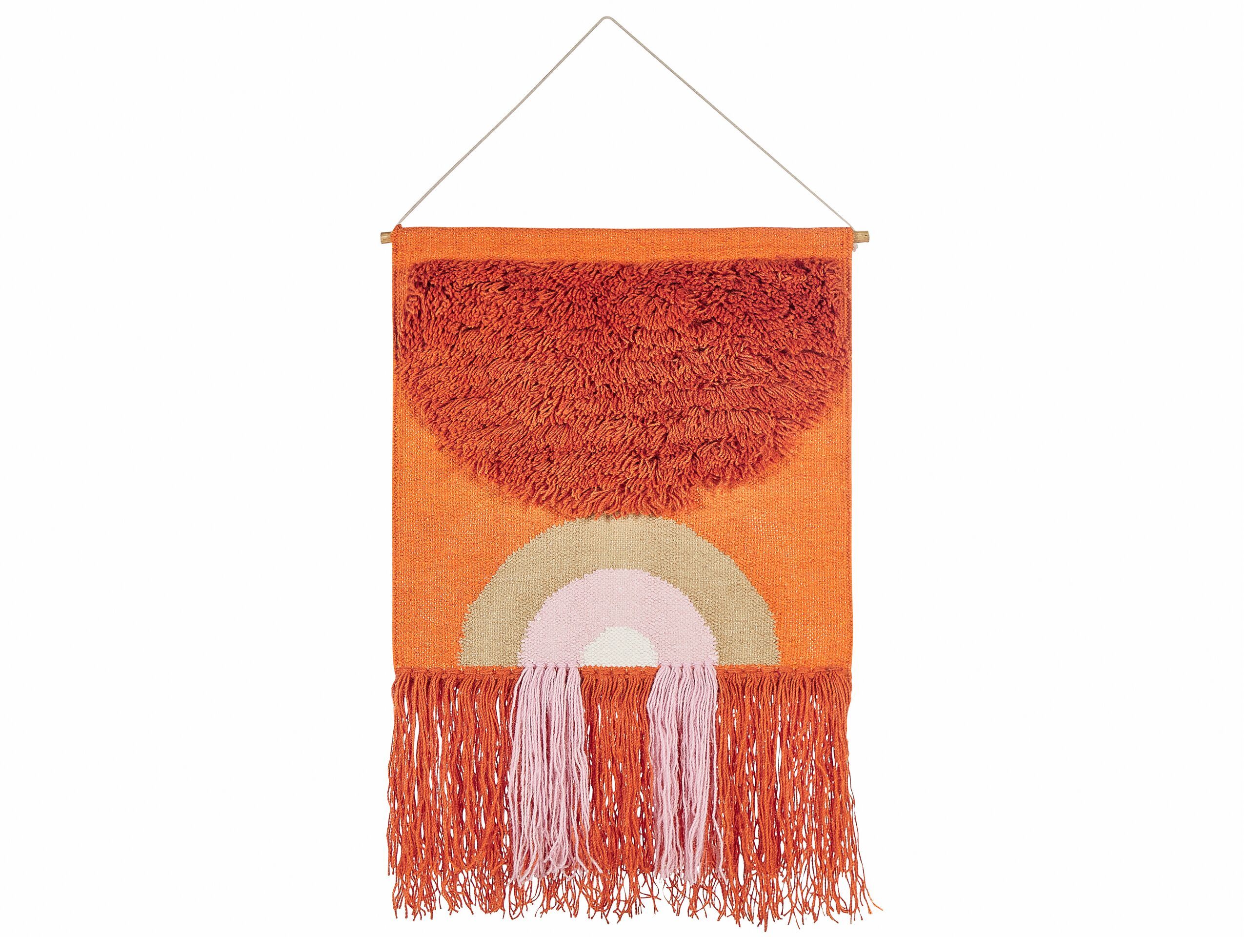 Bring a boho feel to your living room or bedroom with this exceptional wall decoration. This high-quality piece is handmade from a blend of cotton and wool with attention to details. A beautiful and vibrant orange colour will nicely enliven any space. Details: Color: Orange, Pink, White, Brown. Main material: Cotton. Additional material: Wool, Eucalyptus Wood. Weight: 0.9 Assembly: Does Not Require Assembly Wood type: Eucalyptus grandis Wood Origin: China