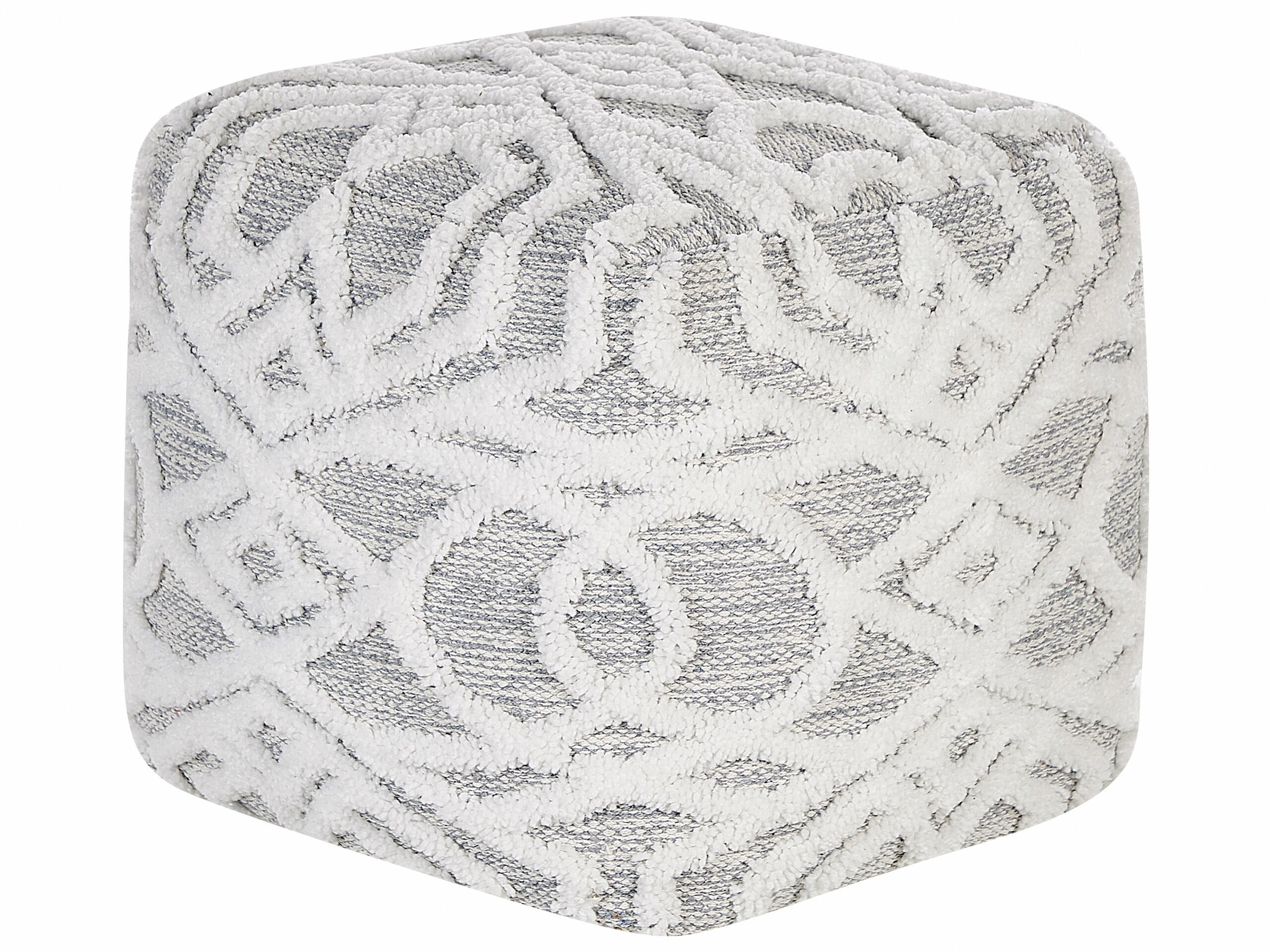 Make your interior feel unique with this exceptional pouffe. Its original design with the sewed-on fluffy thread in the shape of a geometric pattern creates a marvellous effect that will certainly draw the attention of any of your guests. The product is multifunctional, you can use it as an extra seat whenever someone comes over, as a side table to keep your snack at hand, or as a footstool to fully stretch out while relaxing on your comfortable sofa. Details: Color: White, Grey. Main material: Cotton. Additional material: Polyester. Material Composition: 80% Cotton, 20% Polyester Weight: 2.7 Assembly: Does Not Require Assembly Weight Capacity: 75