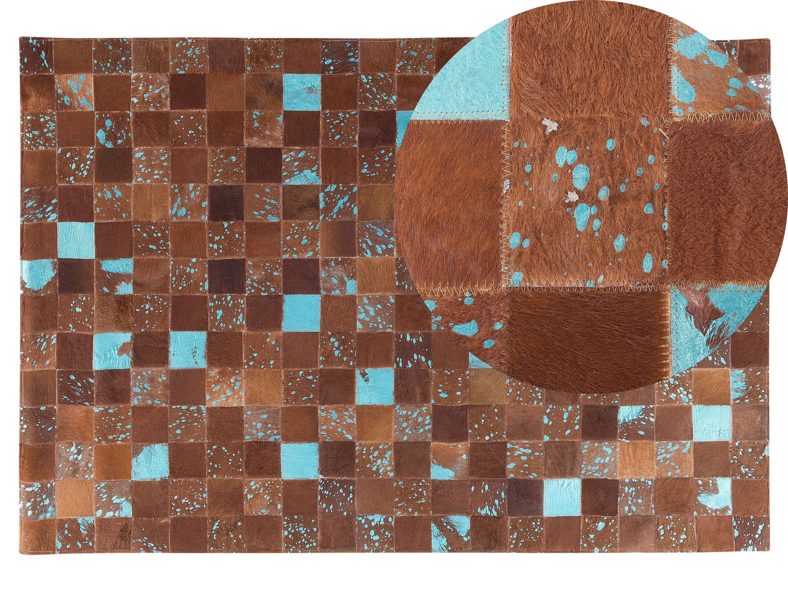 This eye-catching piece will enhance the look of any room. With its unique design, this piece works perfectly in both modern and traditional style home décors. Multiple square pieces of real leather have been sewn together for a stunning effect. The combination of warm brown shades and turquoise hues adds a lively touch, illuminating any room interior. The high-quality material provides durability as well as softness, being soft to the touch and suitable for children’s games. Details: Color: Brown, Blue, Multicolour. Main material: Cowhide Leather. Material Composition: 100% Real Leather Weight: 7 Assembly: Does Not Require Assembly
