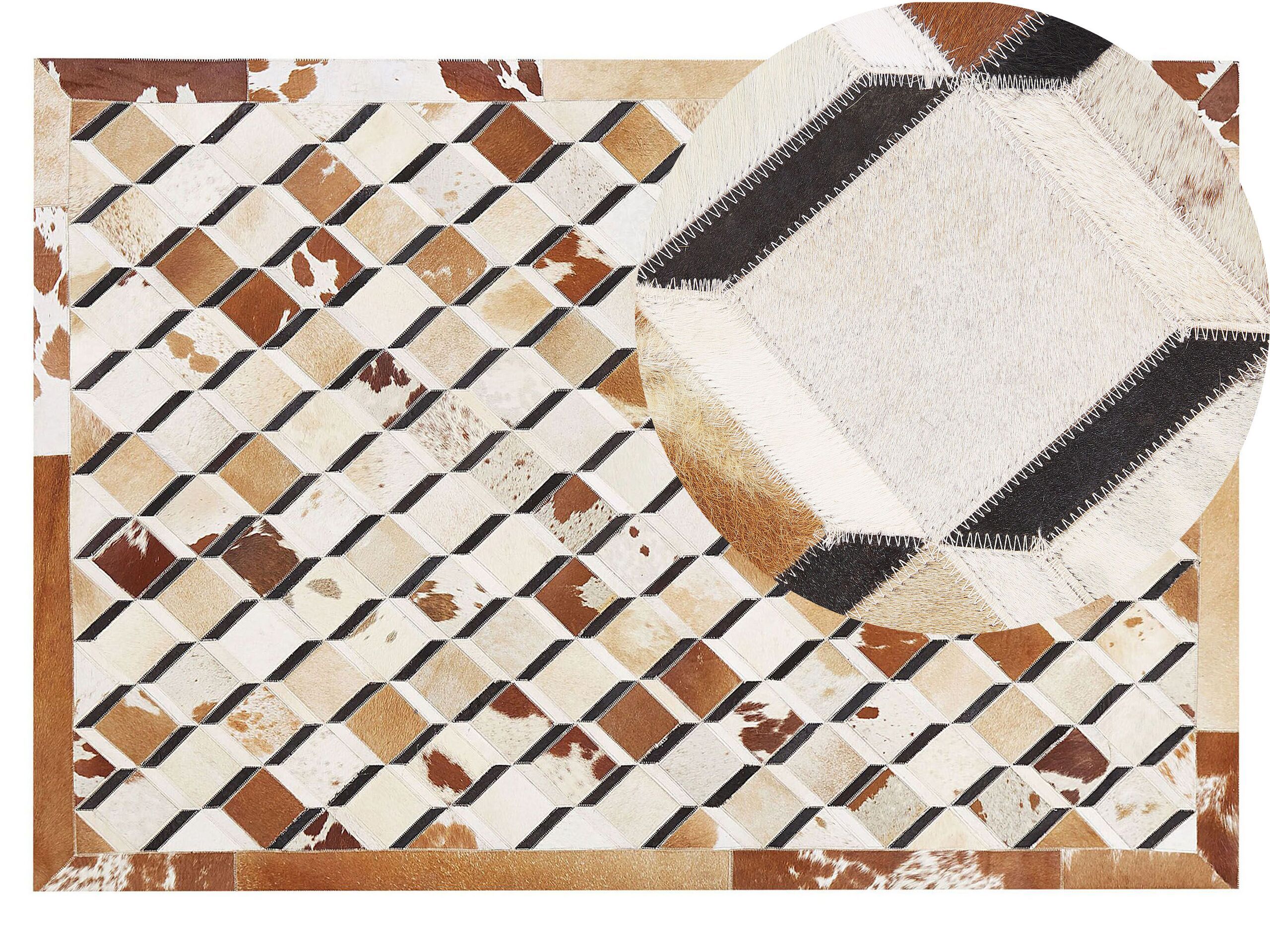 Upgrade your living space with a subtle, yet eye-pleasing accent - a patchwork rug. Made from high-quality cowhide leather, it boasts a classic diamond pattern for a modern look. The warm brown and beige tones instantly grant a cosy feel to any living or office space. The rug features a polyester felt backing for extra durability and protection. Details: Color: Brown, Beige. Main material: Cowhide Leather. Material Composition: 100% Real Leather Weight: 5 Assembly: Does Not Require Assembly