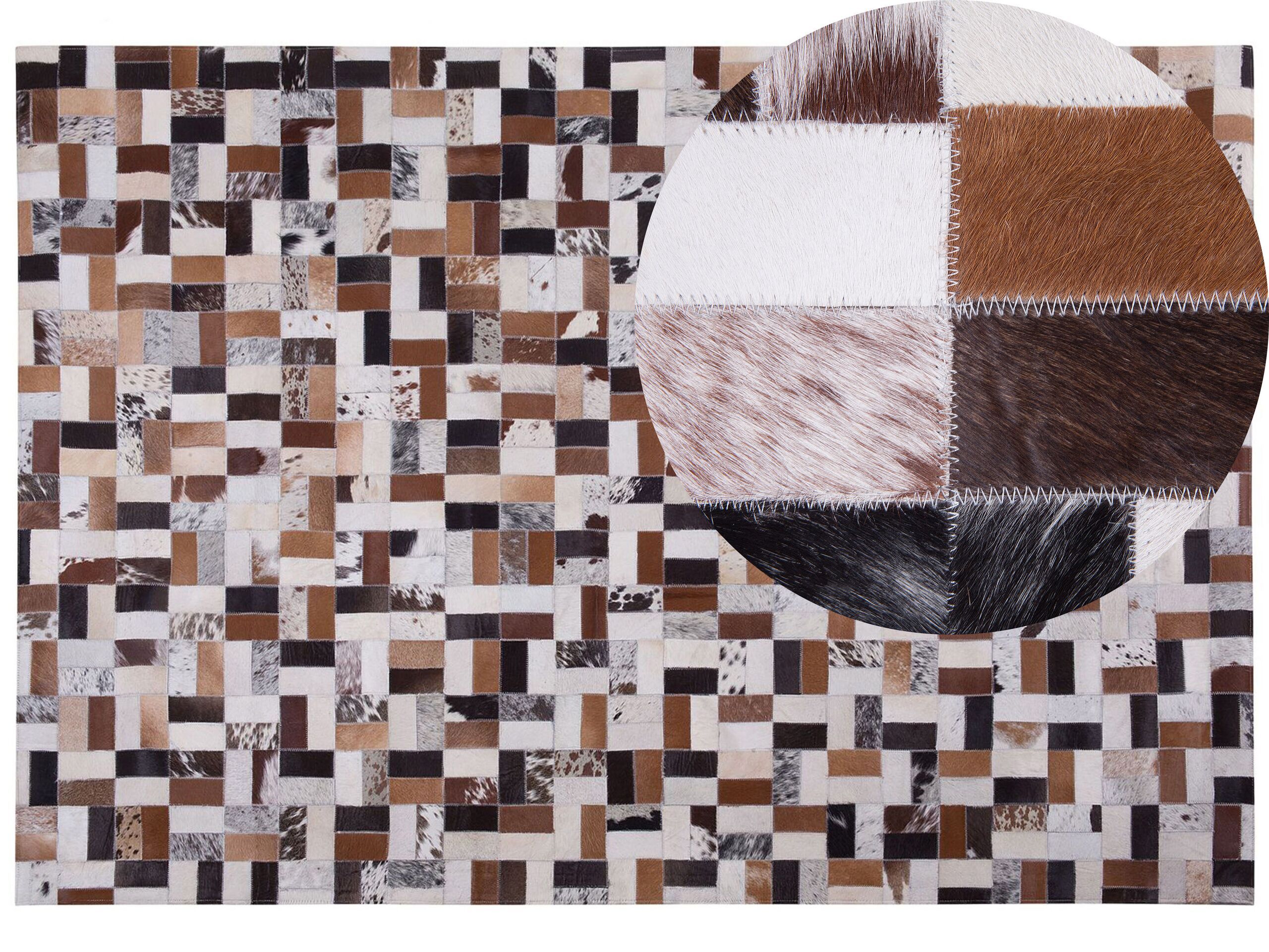 An excellent leather rug that complements any room perfectly. Sewn together using genuine cowhide leather and woollen threads for a sophisticated look. A unique, geometric pattern creates a stunning visual effect, while solid construction guarantees durability for years to come. This area rug can be a perfect piece for an interior in modern or transitional decor. Details: Color: Multicolour, Black, Brown, Grey, Beige. Main material: Leather. Material Composition: 100% Real Leather Weight: 7 Assembly: Does Not Require Assembly