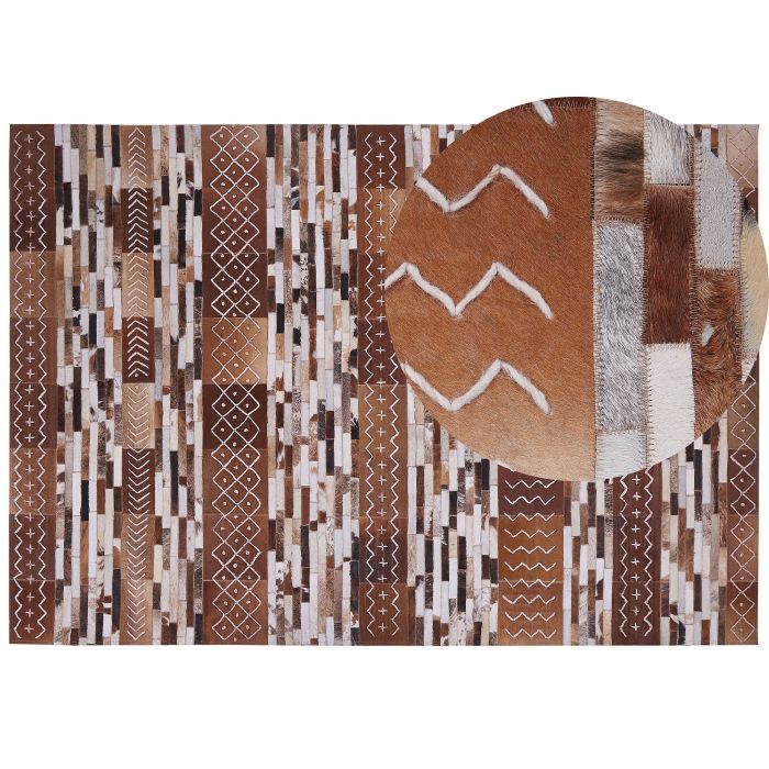 This rug is a true representative of ideal balance between rustic and Scandinavian styles. Made from high-quality, hair on leather stripes in warm, brown tones, it perfectly matches modern and traditional interiors. It boasts beautiful patterns contrasting with the dark background which makes it a true highlight for any house or flat. Details: Color: Brown. Main material: Cowhide Leather. Material Composition: 100% Real Leather Weight: 8 Assembly: Does Not Require Assembly