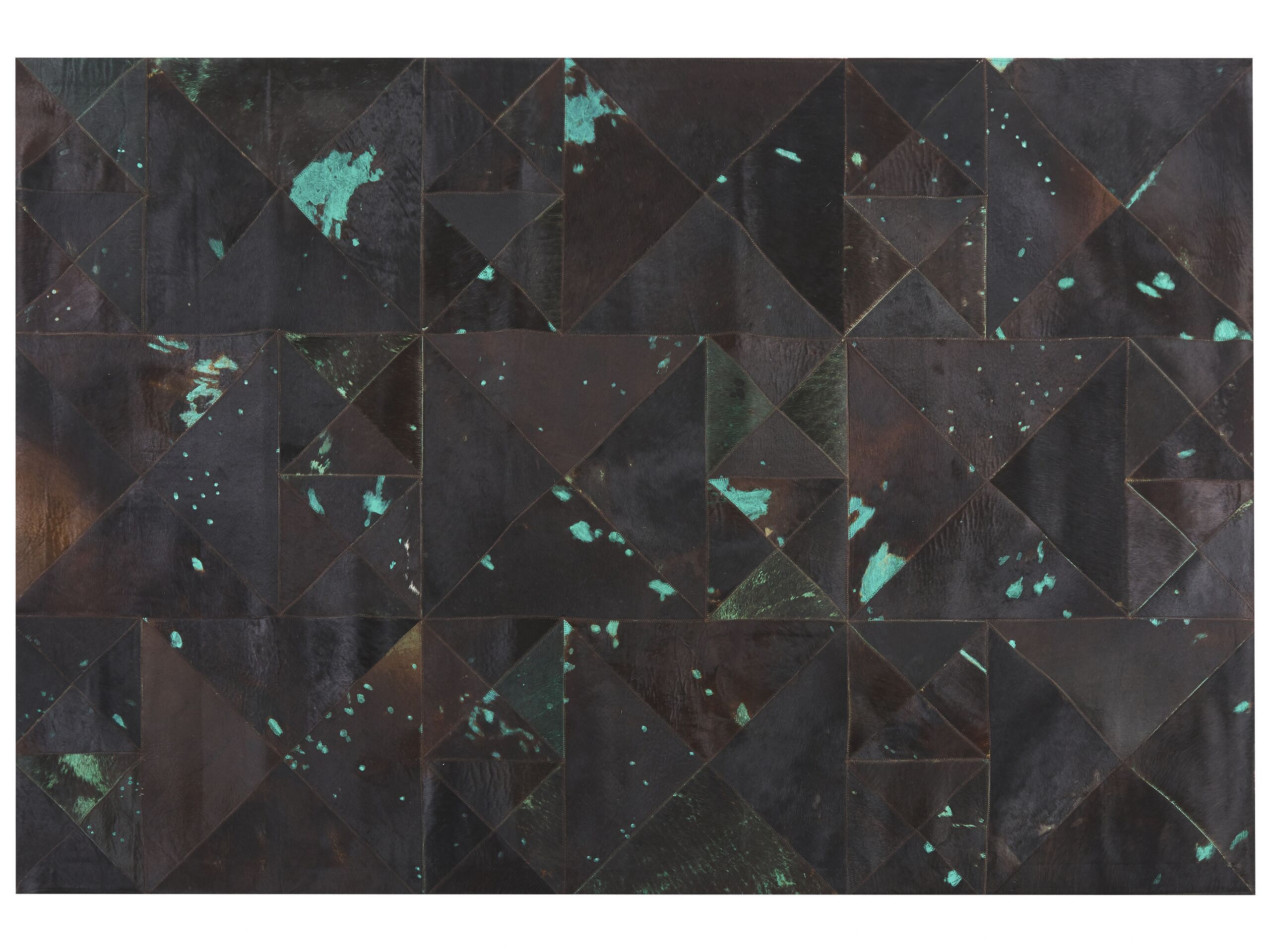 An ultra-modern, unique carpet made of genuine leather. Bold and elegant, it enchants with its geometric pattern and a mix of deep brown and vibrant turquoise spots. Sure to catch every eye, the rug is perfect for a modern or retro interior while maintaining its magnificent look for years, thanks to the protective underlay and precise, high-quality stitching. Details: Color: Brown, Blue. Main material: Cowhide Leather. Material Composition: 100% Real Leather Weight: 8 Assembly: Does Not Require Assembly