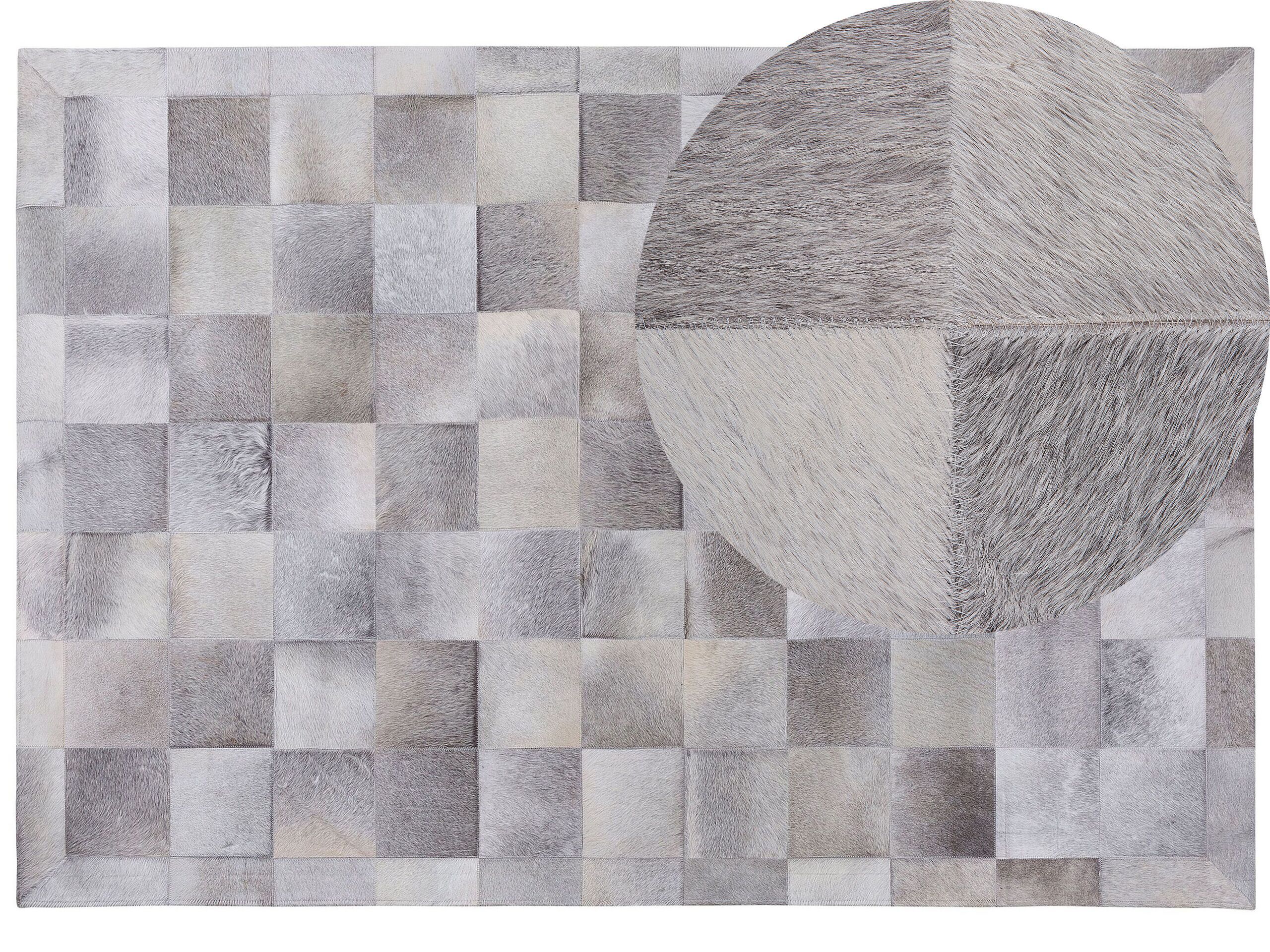 This stunning patchwork rug is handcrafted from leather. Large neutral toned squares are sewn together to create a geometric, monochromatic design suited to modern and traditional interiors alike. The hair-on-hide and the protective felt underlay ensure this rug's appearance for years to come. Details: Color: Grey. Main material: Cowhide Leather. Material Composition: 100% Real Leather Weight: 7 Assembly: Does Not Require Assembly