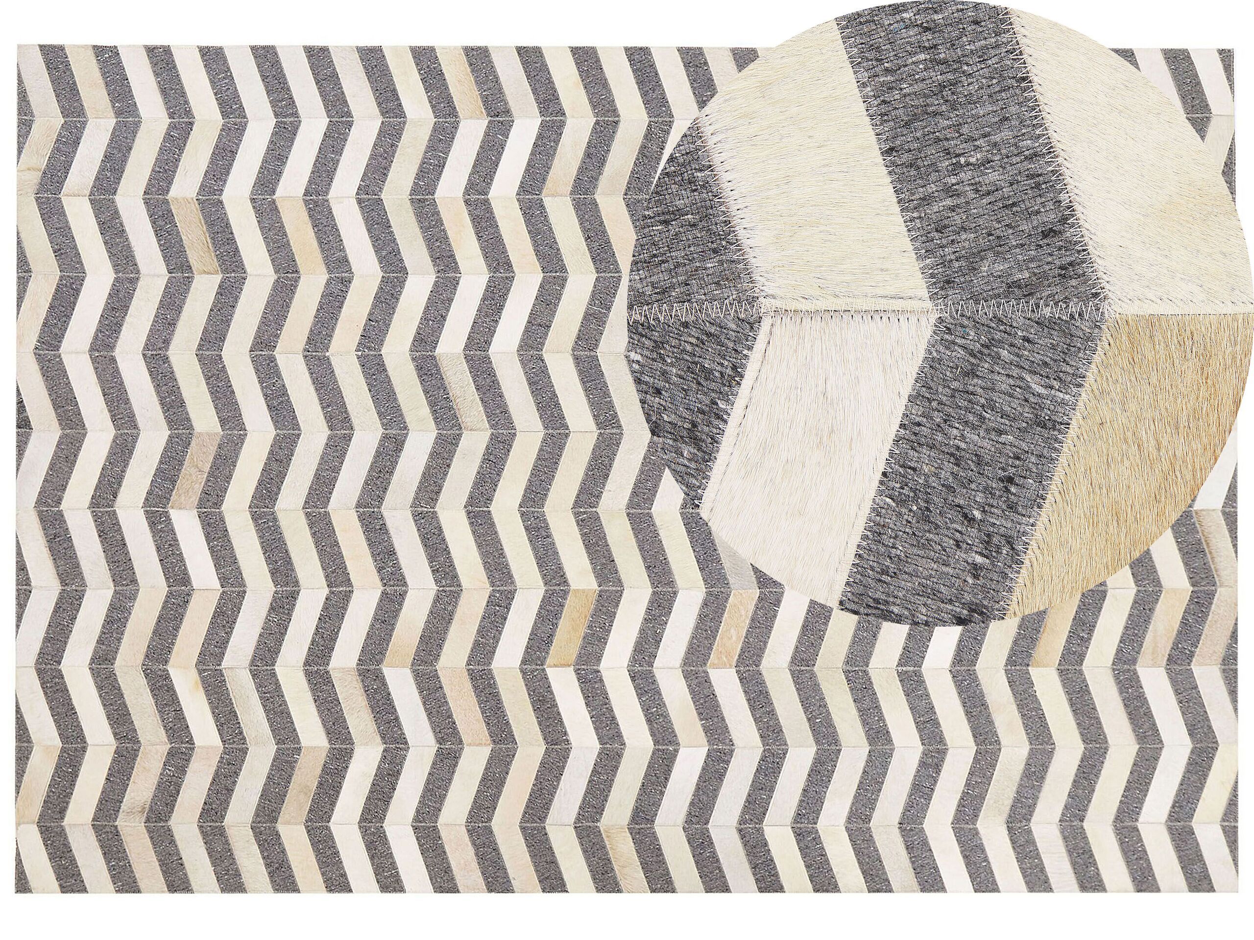 Introduce a cosy accent to your living space with this stunning area rug. Made from durable and long-lasting jacquard and cowhide leather, it perfectly accentuates interiors in modern and contemporary décor. The rug boasts a classic chevron pattern in contrasting dark grey and beige that makes it stand out on both, dark and light hardwood floors. The felt underlay provides extra floor protection and additionally strengthens the rug increasing its longevity. Details: Color: Grey, Beige. Main material: Jacquard. Weight: 6 Assembly: Does Not Require Assembly