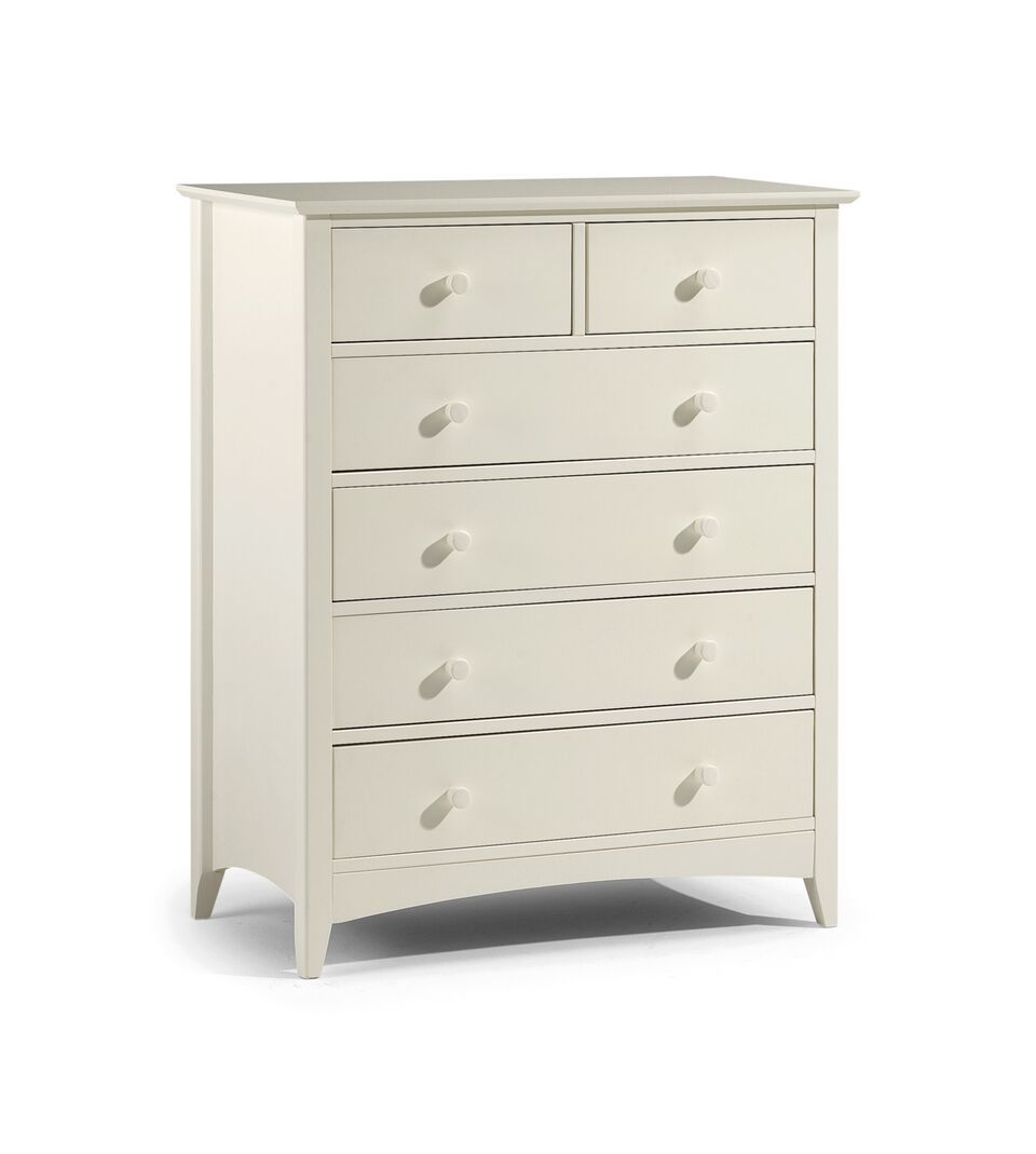 Cameo is a beautiful stone white lacquered bedroom range. Its timeless shaker design is the perfect accompaniment to any interior style and is perfect for grown-up bedrooms and children's bedrooms alike. Solid pine frames ensure a sturdy and durable construction. The Cameo 4+2 chest offers a great storage solution with 2 small drawers and 4 large drawers
