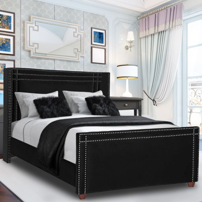 This designer bed creates a modern and contemporary look to your room, classic wingback style accompanied with detailed beading, handcrafted and made in the UK this bed has the wow factor. Elegant beading all around the bed with metal feet. A solid construction with solid slats. Wingback styled headboard and a padded finish