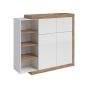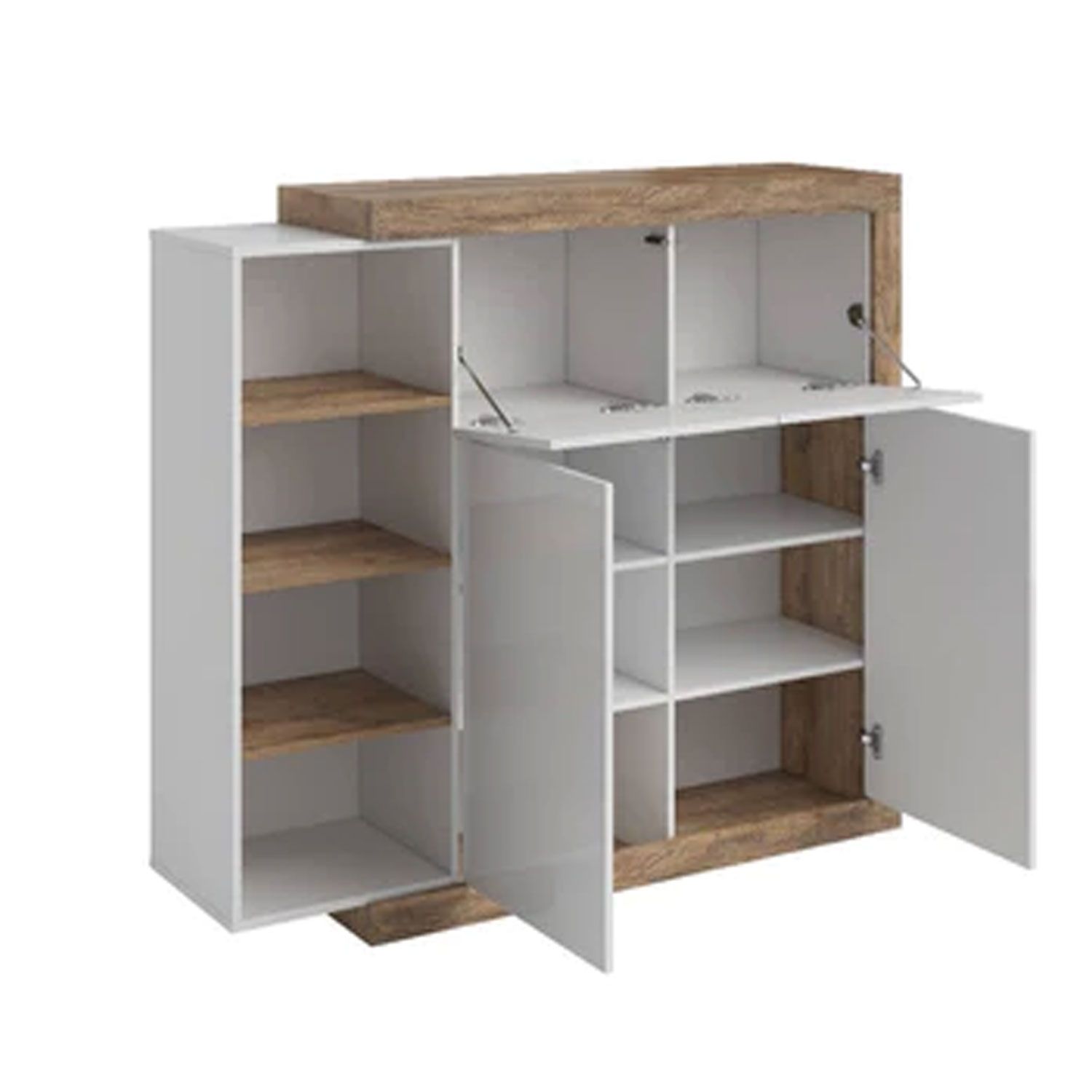 A modern sideboard cabinet with a high-quality finish and versatile storage options, this is the perfect piece that will complete any interior. Finished in white matt, it has an Oak Sandal veneer and a handle-free structure for added elegance. It features four open compartments and a total of eight covert compartments behind two hinged and two drop-down doors. This is made from 16mm laminated board.