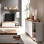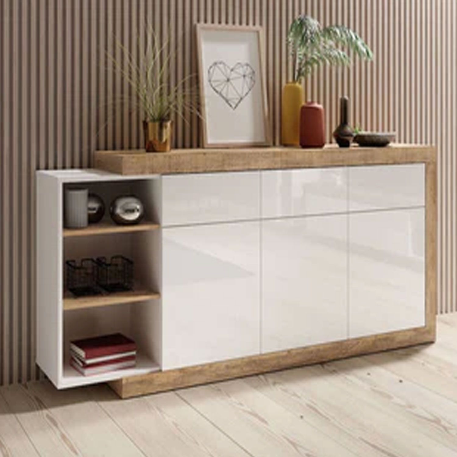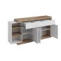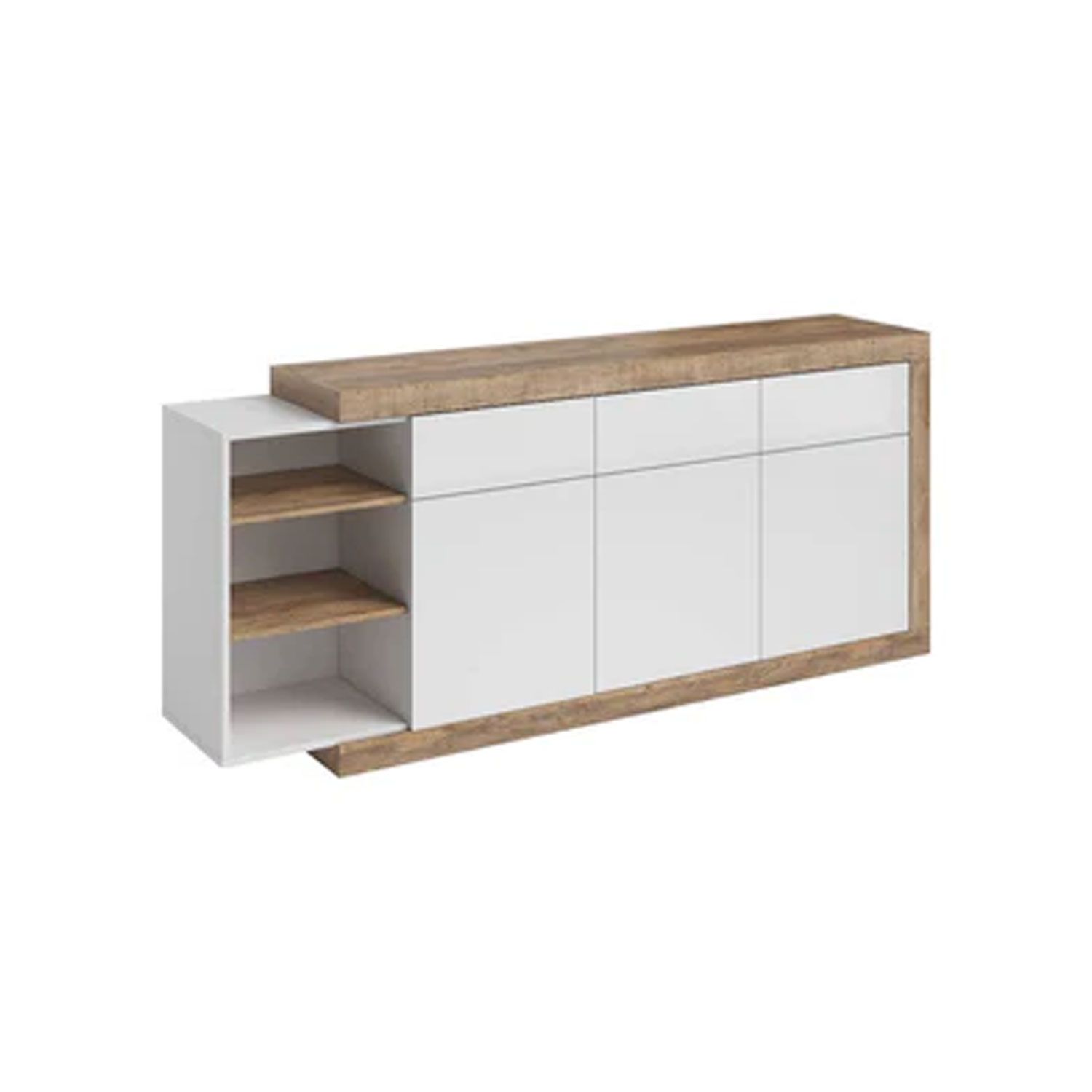 The Cynosure is a multifunctional storage solution that adds a stylish and elegant touch to your living room. This modern sideboard boasts three hinged doors, five shelves and three drawers for all your belongings. Finished in white matt with an Oak Sandal veneer, it is an eye-catching piece of furniture that will harmonise effortlessly with a range of modern and vintage decors. The material used for this sideboard is 16mm thick laminated board, providing protection against knocks, bumps, scratches and warping.