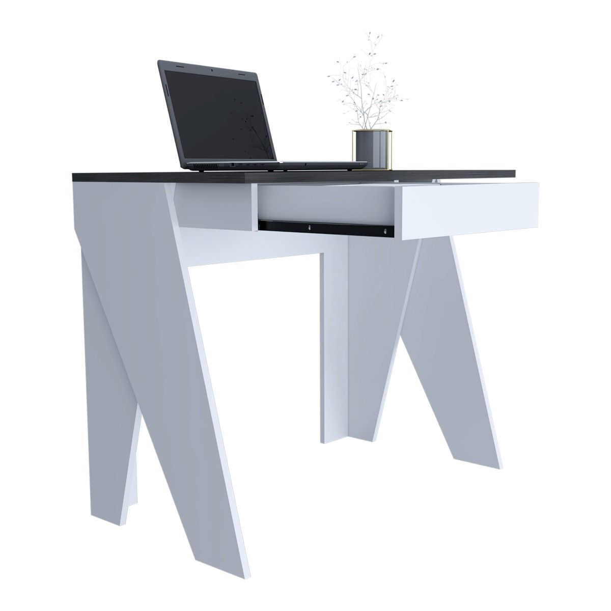 Ideal for working at home, this desk offers drawer and under desk storage along with a dynamic leg design. Made in an easy to clean, hardwearing white and carbon grey oak effect melamine finish with real metal hardware.
