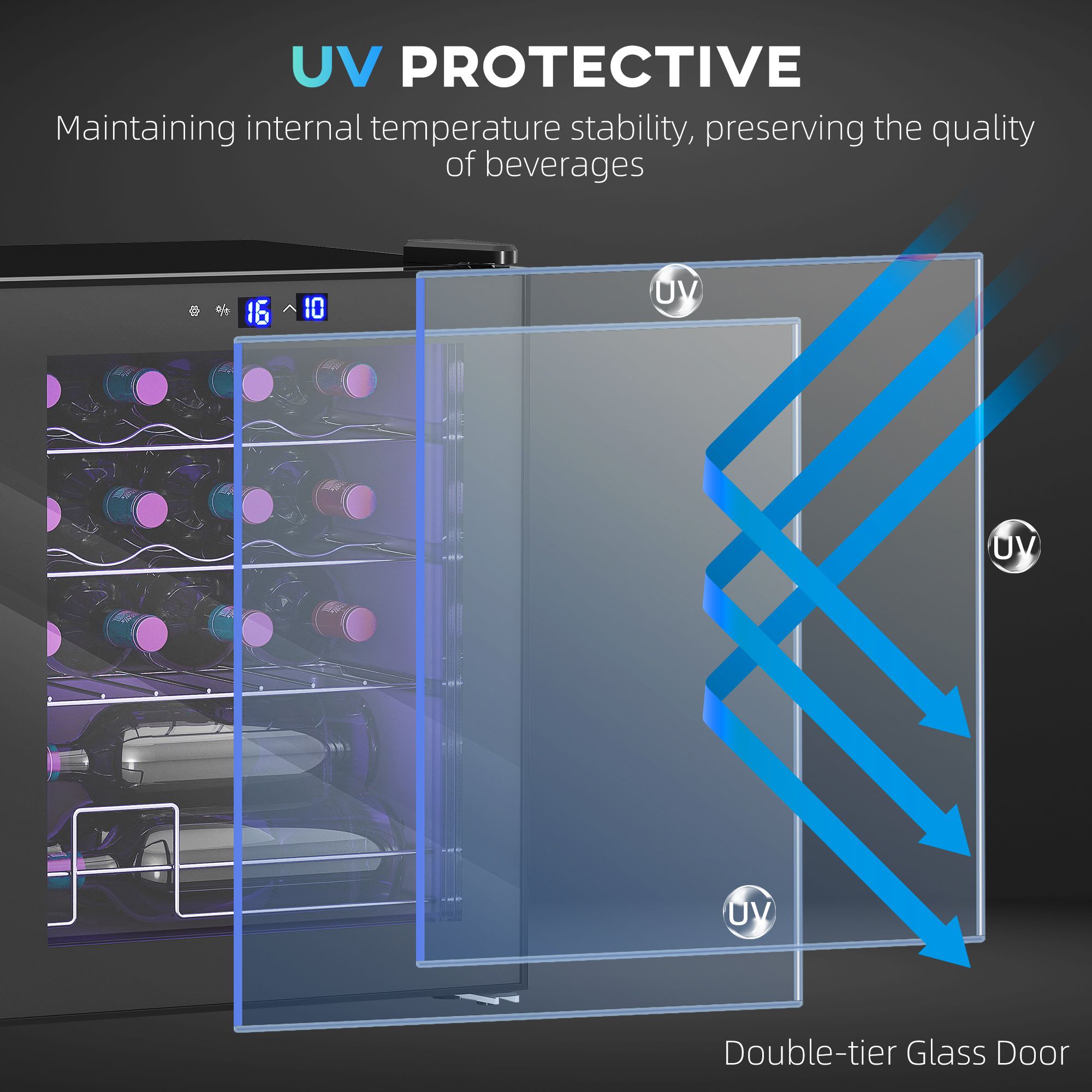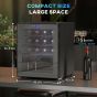 Bottles and more kept beautifully chilled, with this HOMCOM 42L wine fridge. Set the temperature between 5 - 18°C - it's easy to keep drinks chilled how you want. It's fitted with a double-layer glass door, which shields bottles from harmful light; the blue light makes it easy to see inside. The removable shelves hold 16x 750ml bottles - meaning you'll never run out of a cold drink during dinners and parties. 5 - 18°C temperature: Advanced compressor sets fridge to the temperature you want, with a handy memory function. Keep beers, wines, soft drinks and more chilled and ready to serve. LED display shows working temperature. Four racks, holds 16 bottles: Removable wire shelves in 42L wine cooler holds standard 750ml bottles. Room for lots of bottles - plenty when hosting parties and dinners. Double layer UV-resistant glass: Blocks UV and heat to maintain a stable temperature. Soft blue LED light illuminates inside, to see through the glass Compact size, 41dB working noise: Wine fridge fits easily into smaller spaces, and the noise output is low - you'll hardly notice it's there.