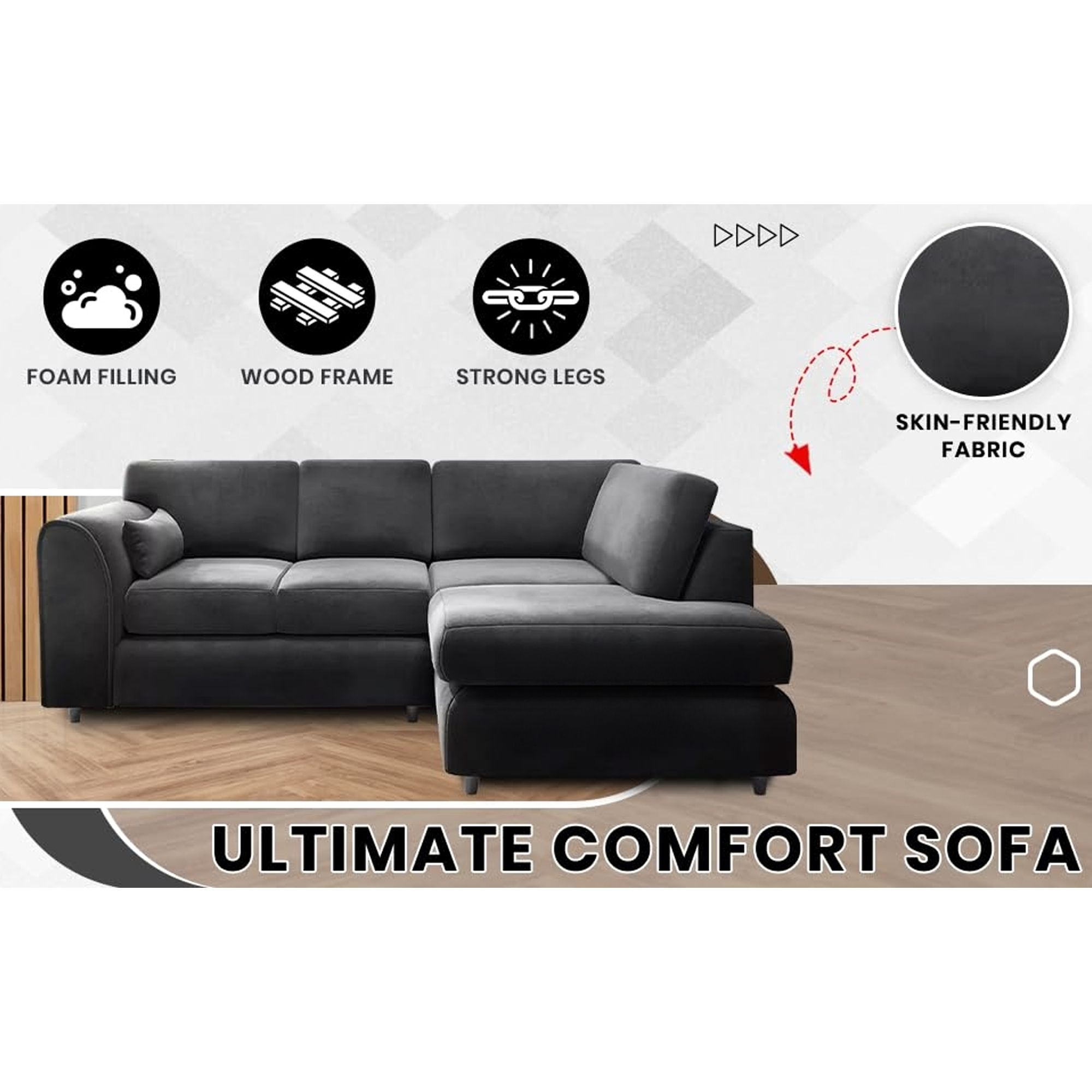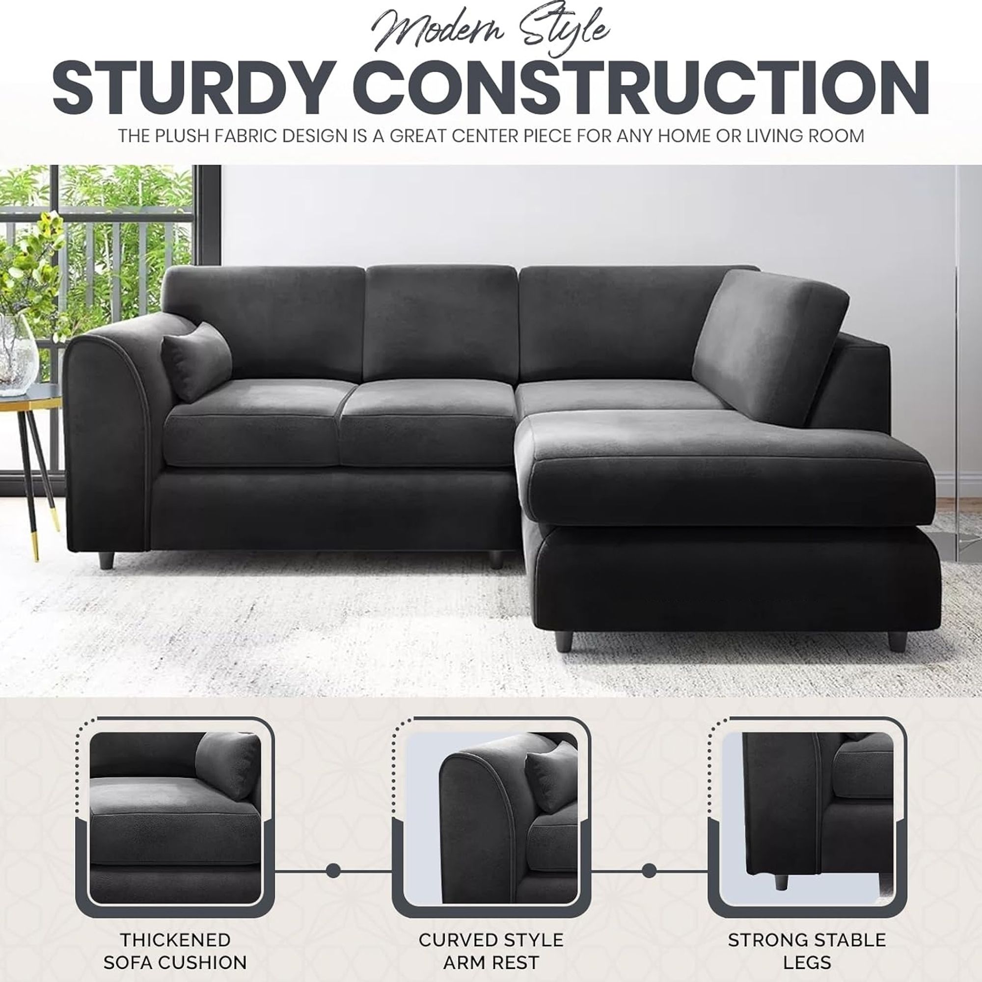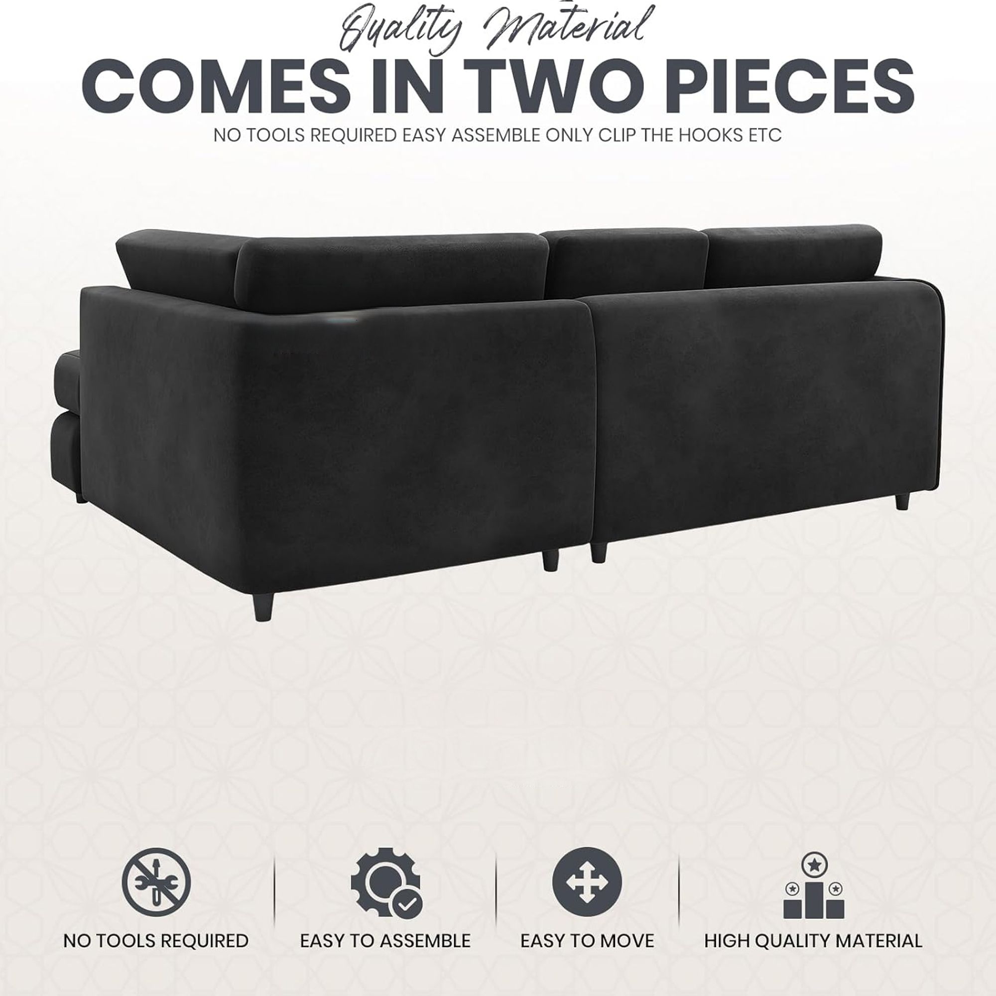 Upholstered in plush velvet, this L-shaped sofa is designed with gracefully angled arms, offering a sleek, modern look. Built on a sturdy wooden frame, it ensures lasting durability while providing ample, cozy seating for family and guests. Its elegant black finish adds a contemporary, timeless touch, making it the ideal centerpiece for any room. Experience ultimate comfort and refined design with the Calviro 4 Seater sofa.