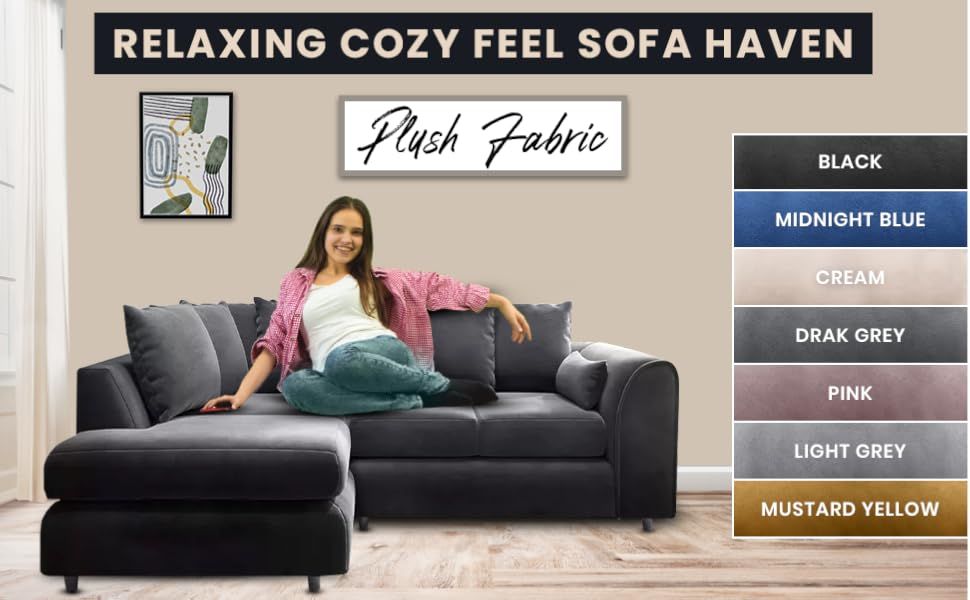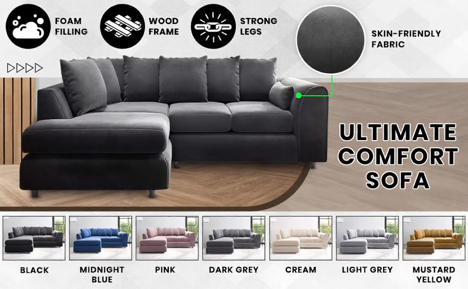 Upgrade your living room with the DELANO 4 Seater Left Hand Facing Corner Sofa, where luxury meets comfort. Upholstered in soft plush velvet and supported by a durable wooden frame, this elegant corner sofa combines style with practicality.