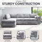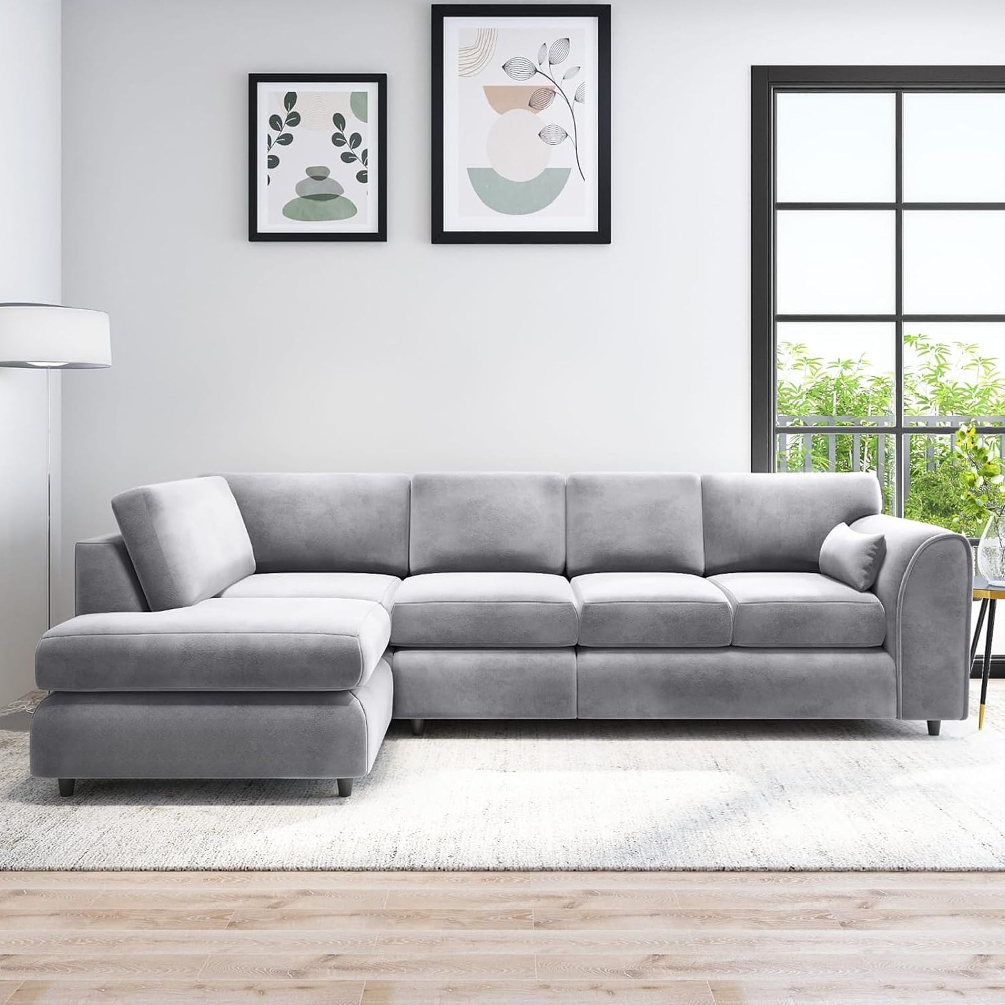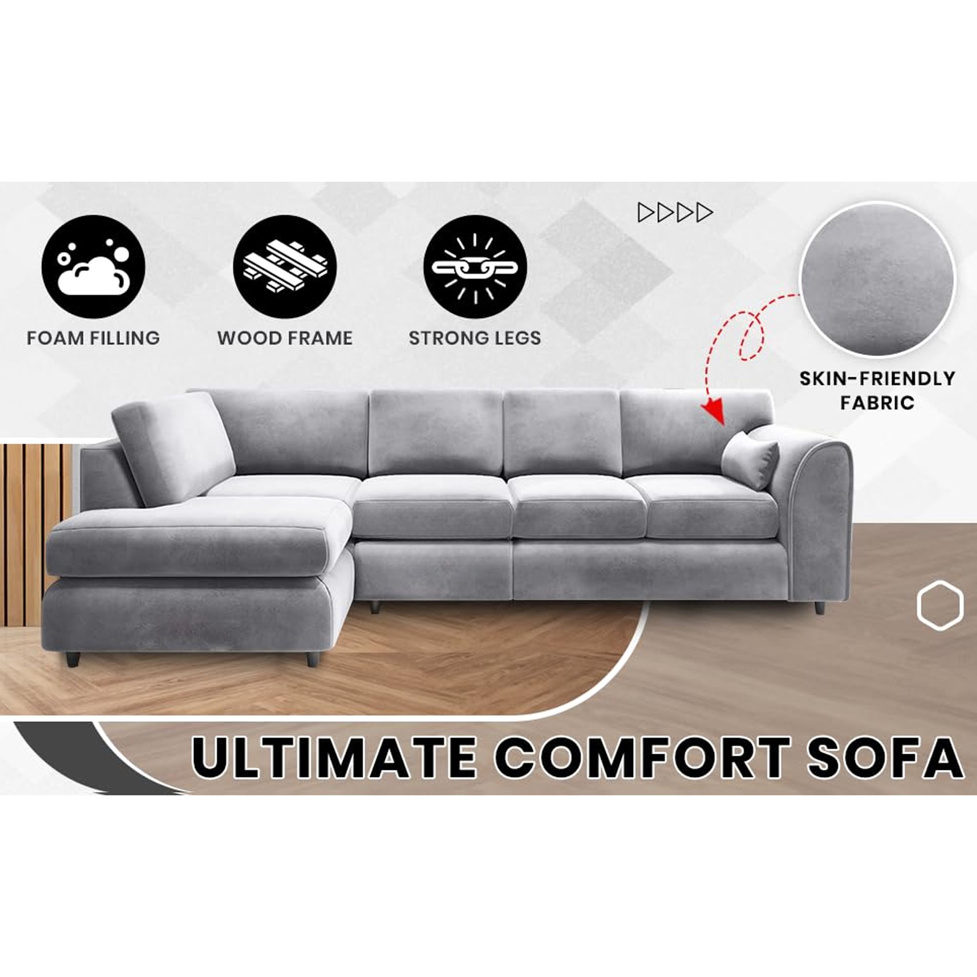 DELANO Plush Velvet Large 5 Seater L Shaped Fullback Corner Sofa - Light Grey, Left Hand Facing