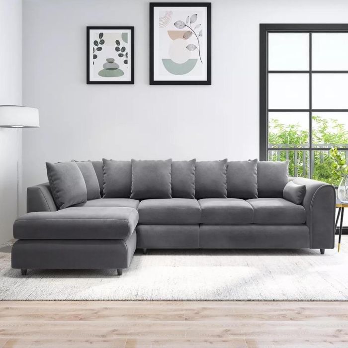 DELANO Plush Velvet Large 5 Seater L Shaped Scatterback Corner Sofa - Dark Grey, Left Hand Facing