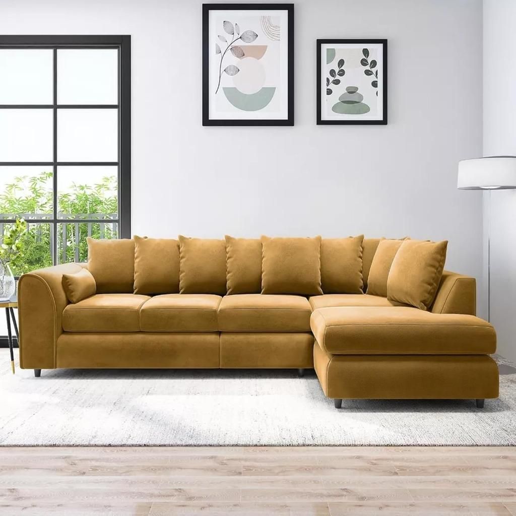 DELANO Plush Velvet Large 5 Seater L Shaped Scatterback Corner Sofa - Mustard, Right Hand Facing