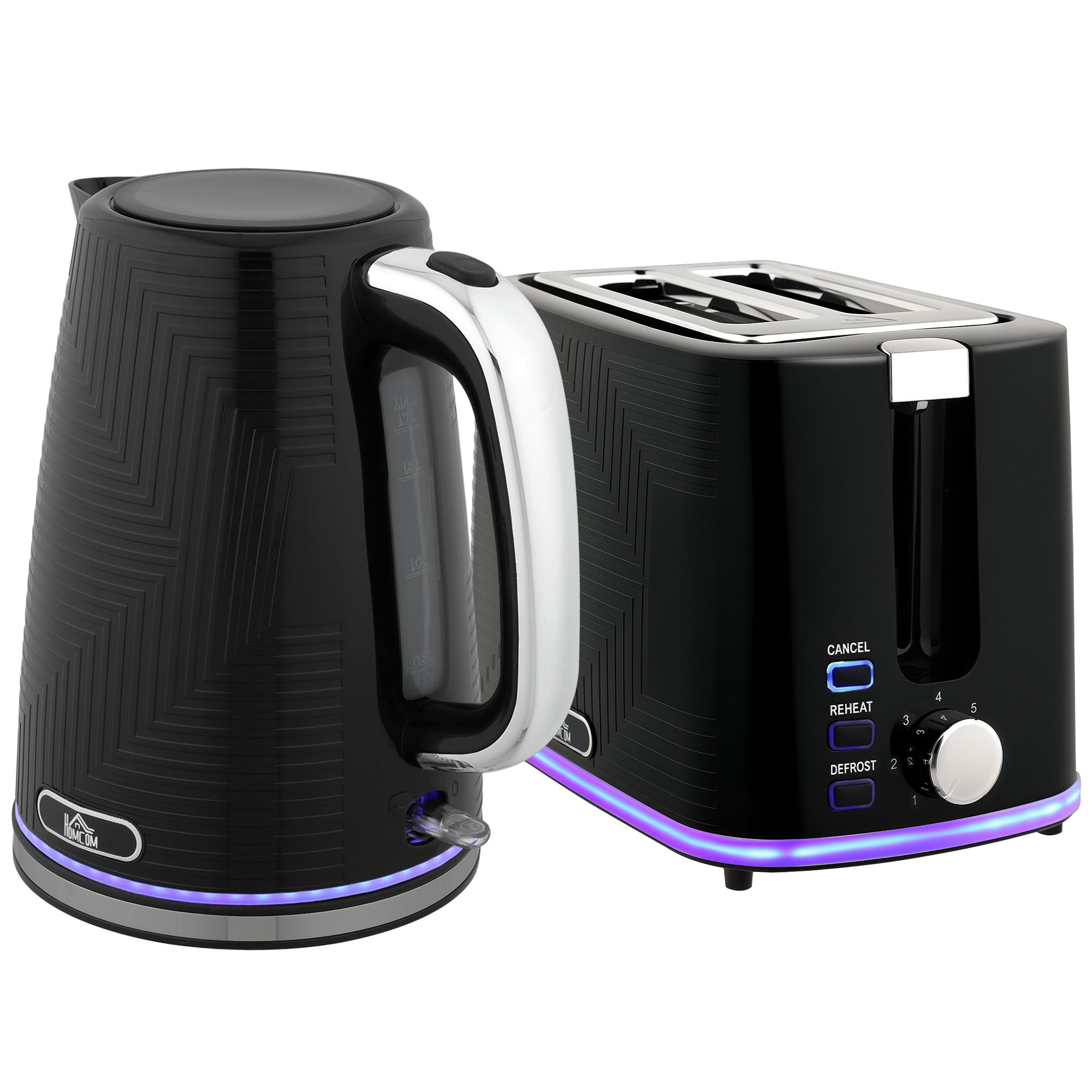 A simple, sleek addition to worktops with this HOMCOM toaster and kettle set. Gently curved, textured all over and with glowing lights, this set looks great as part of your appliance collection. The 1.7L kettle with Otter thermostat delivers fast, precise boiling, plus with safety features (auto shut-off, boil-dry and overheat protection) for peace of mind. The two-slot toaster has seven browning levels, for perfect toast every time. Modern, polished design: Gently curved in a high-shine finish, with glowing lights, this toaster and kettle set is an attractive addition to all kitchen countertops. 3000W rapid-boil kettle: A high-performance kettle, it heats up 1.7L in minutes - enough for seven cups. The clear side window allows you to easily see the water level. Otter thermostat: A trusted way for accurate temperature control. Helps with auto shut-off, boil-dry and overheat protection for safety. Two slice toaster: Features a defrost, reheat and cancel function, plus seven browning levels - toast bread to the level you want. Automatically centres bread slices for even toasting and pops up once done for easy, hassle-free operation