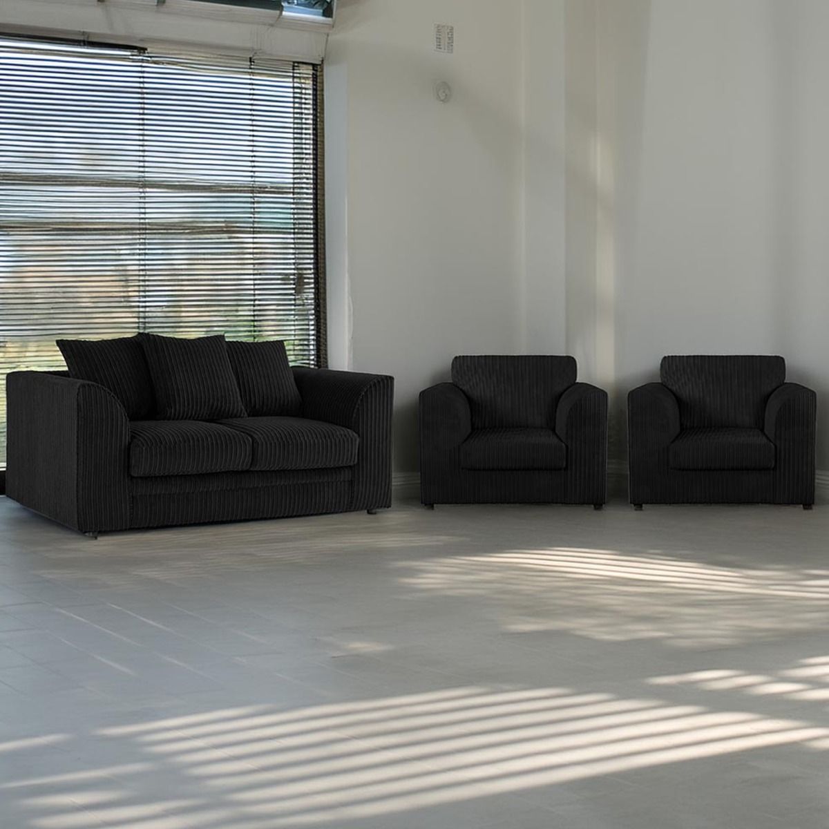 Experience comfort and style with the Desmond Scatterback Black Sofa Set, upholstered in soft jumbo cord fabric with chic scatter cushions and elegant curved arms. Built with premium foam and spring seats, it offers lasting support and a cozy feel for everyday lounging. Available in versatile designs including 2-Seater, 3-Seater, 4-Seater, Armchair, Swivel Chair, Corner Sofa, and Footstool the perfect fit for any room size. Available Colours: Grey, Black, Chocolate Brown, Coffee, Mink, and Cream.