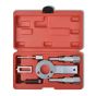 This diesel setting/locking kit contains all tools required for timing belt replacement on Vauxhall/Opel and Saab vehicles fitted with 1.9CDTi/TiD enginesm, applicable to Saab 9-3 (04-08), Saab 9-5 (05-08), Astra-H, Vectra-C, Signum (04-07) and Zafira-B (05-07).The setting/locking kit contains tools to fit on to the crankshaft pulley to stop the crankshaft rotating. Also included is a fly wheel locking tool and camshaft locking pins. This tool set is crafted by hardened and tempered steel, ensuring its maximum durability for years of use. All tools are well stored in a sturdy case for easy transport.