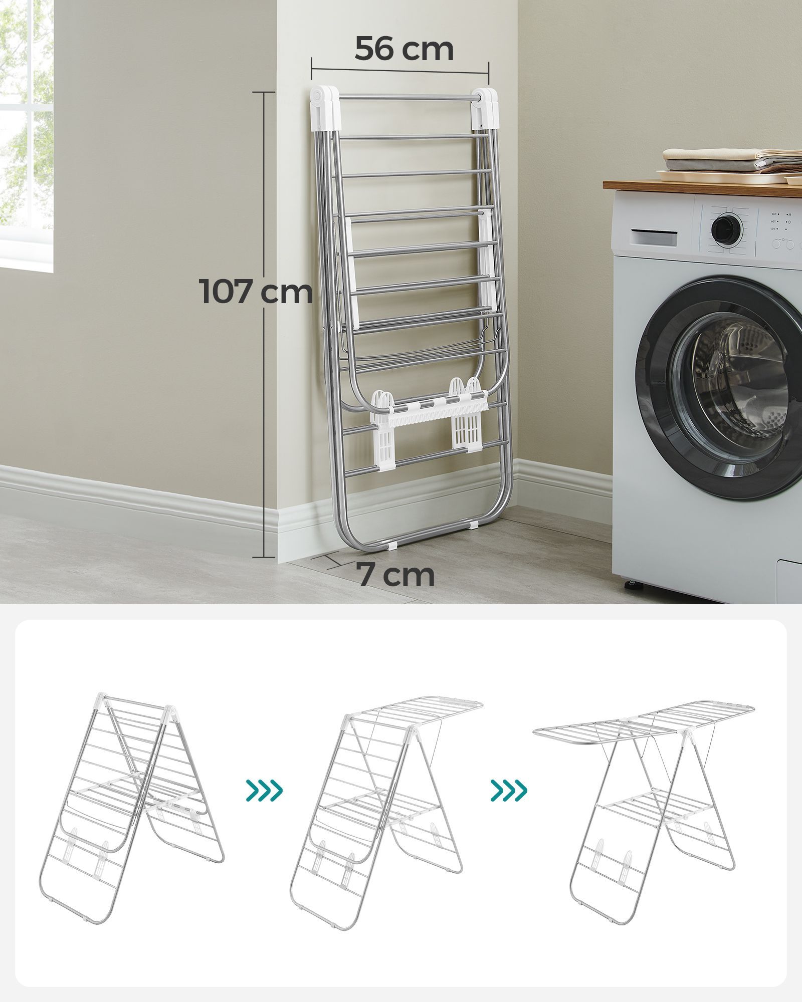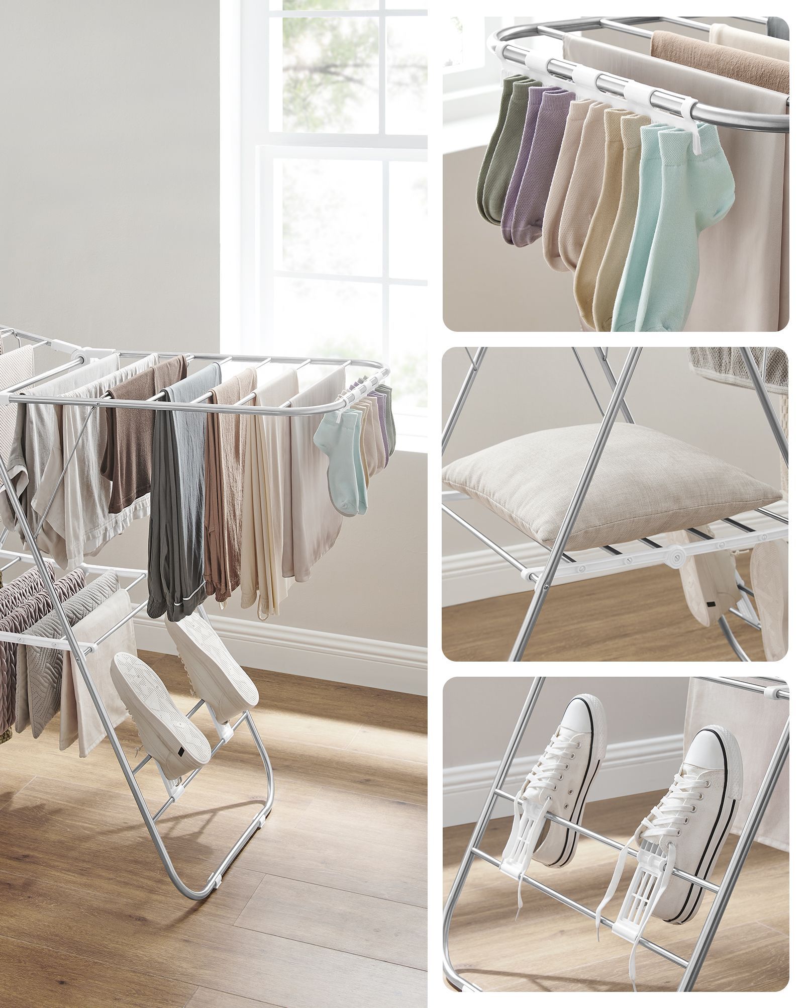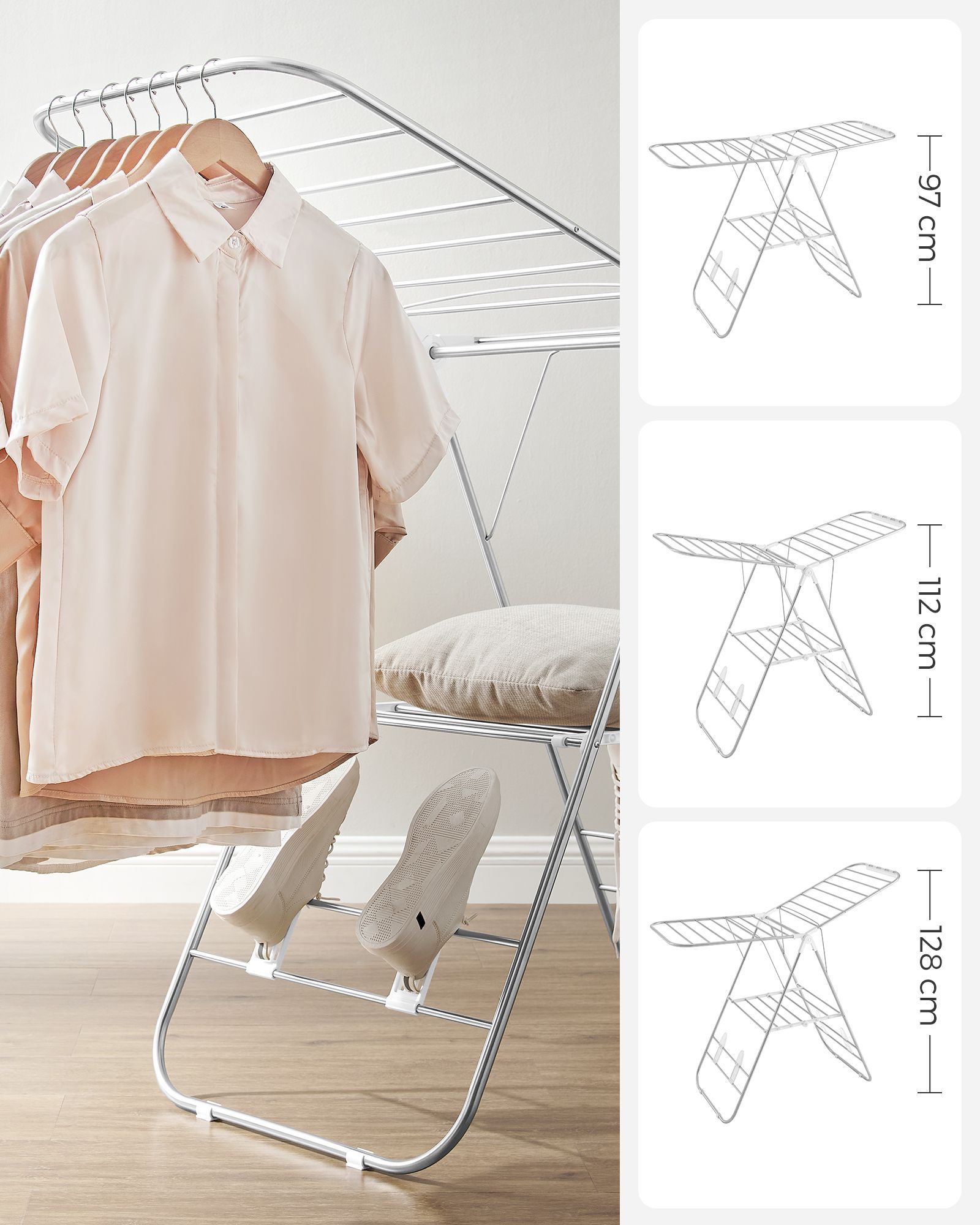 Clothes Airer, Foldable Clothes Drying Rack, Clothes Horse with Height-Adjustable Wings, Free-Standing Laundry Drying Rack, Indoor and Outdoor Use, Stainless Steel, White and Silver LLR502W01