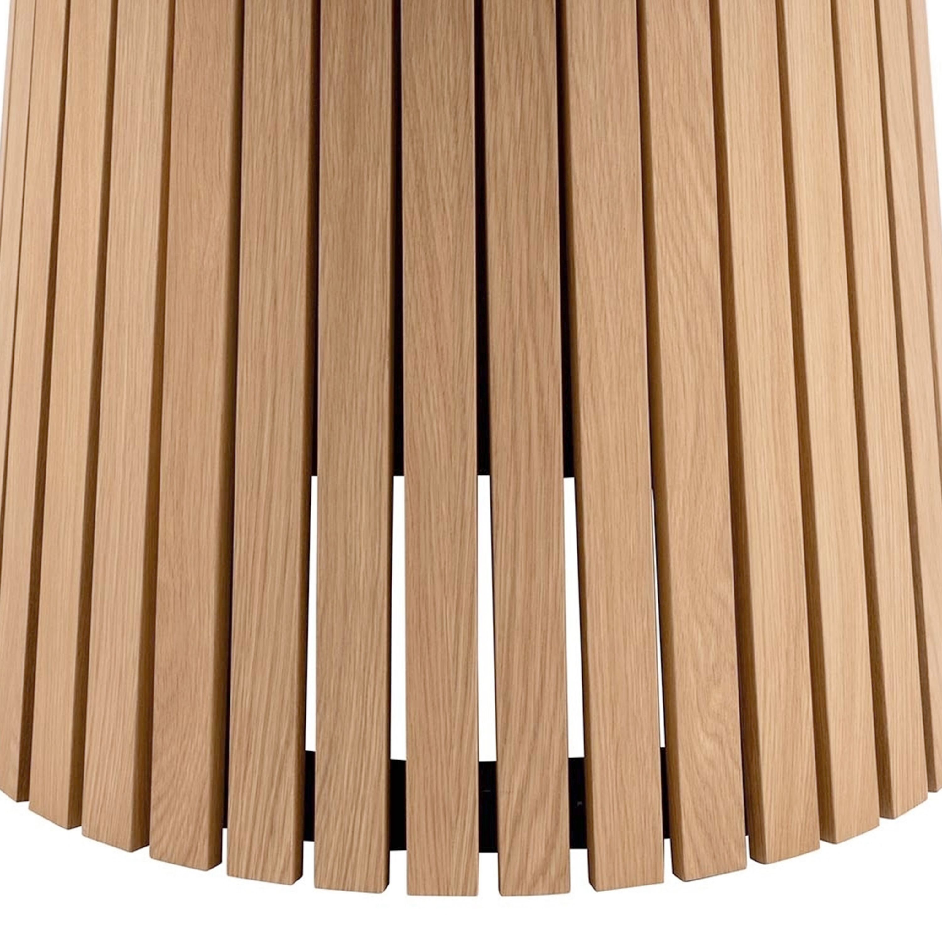 Enjoy delightful dining with this round, matt oak veneer table for 4. Its conic slat base adds warmth and sunray-like aesthetics to your dining room