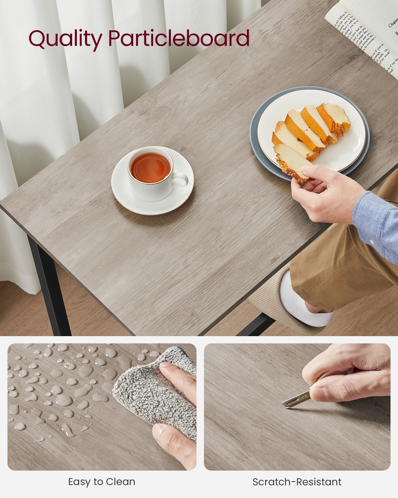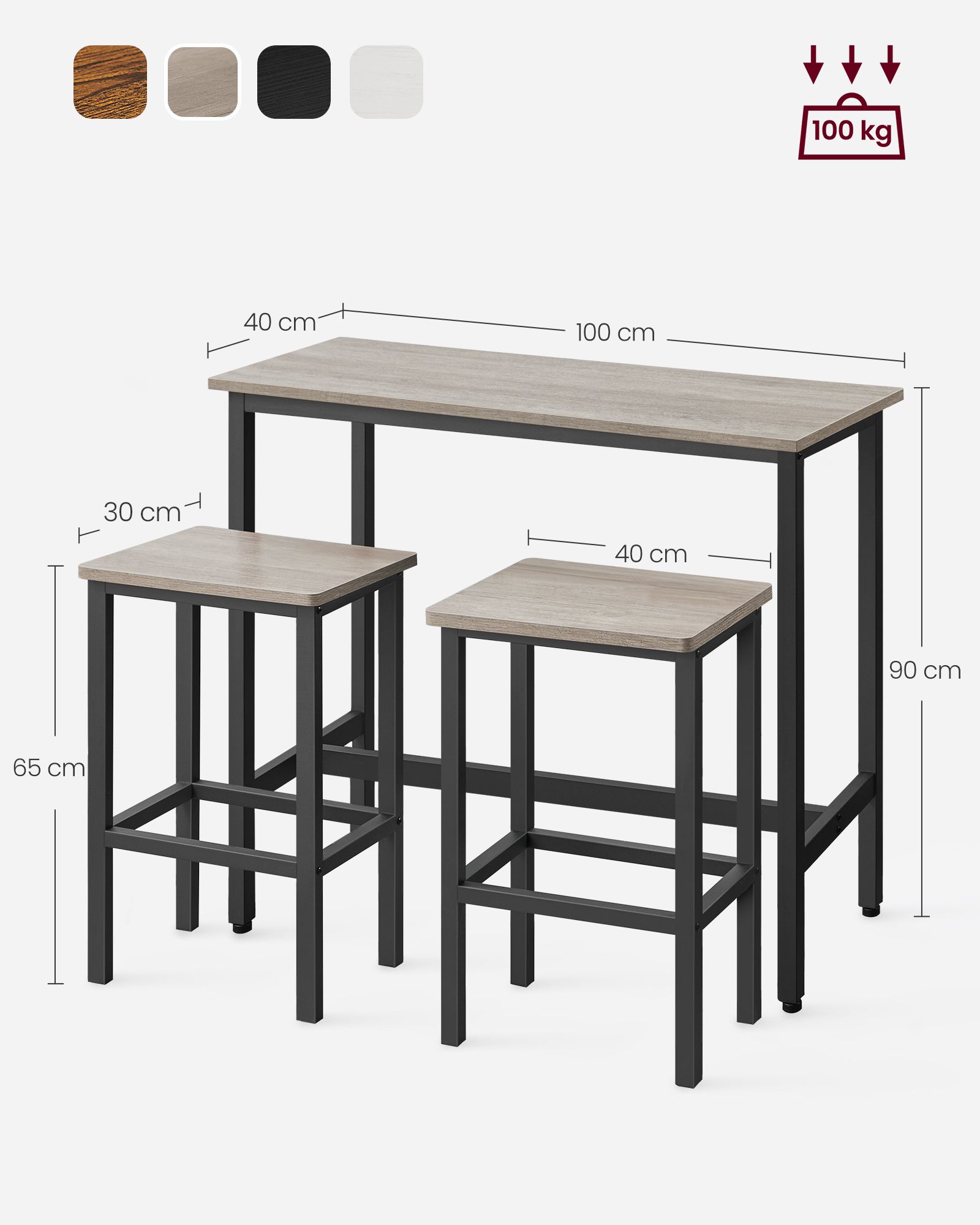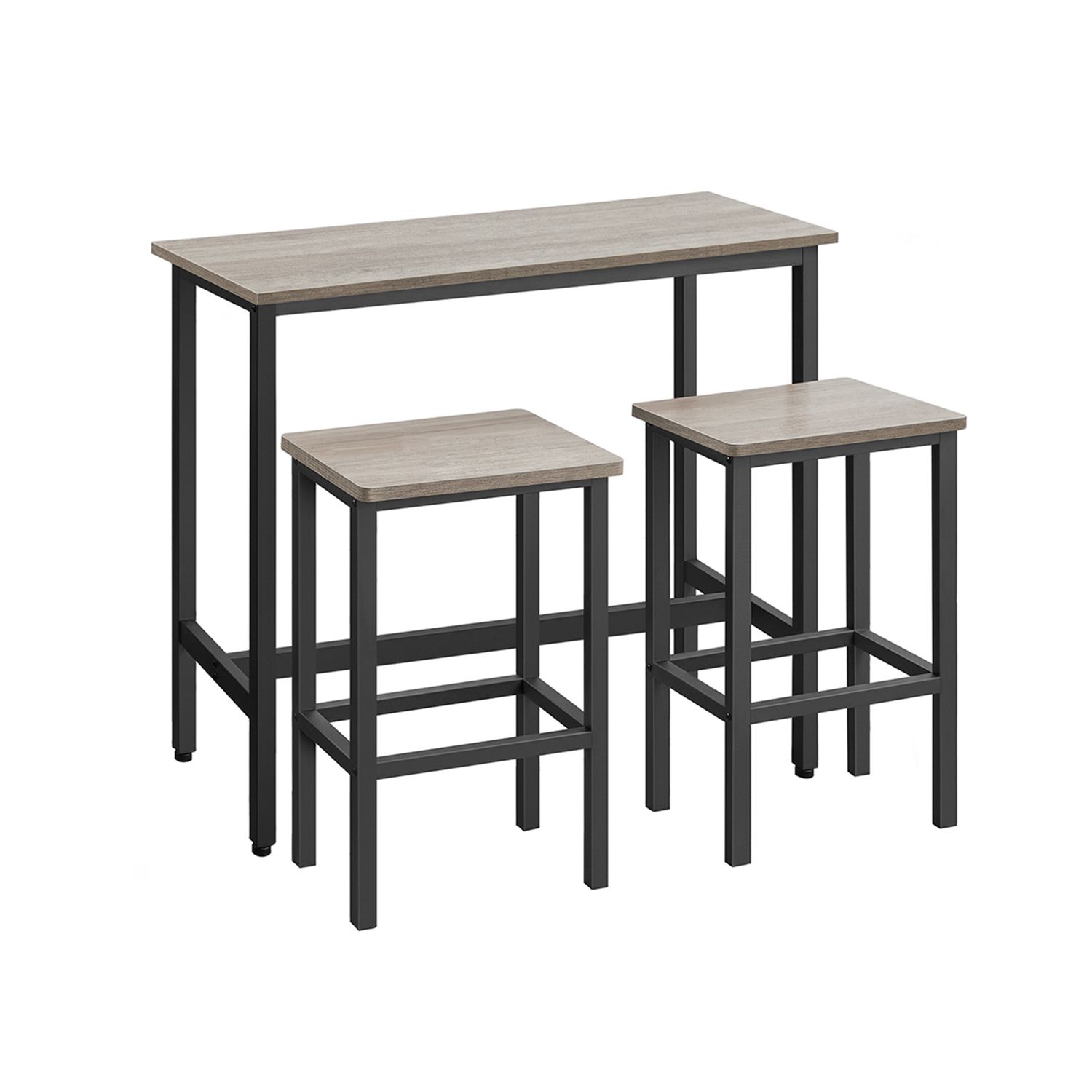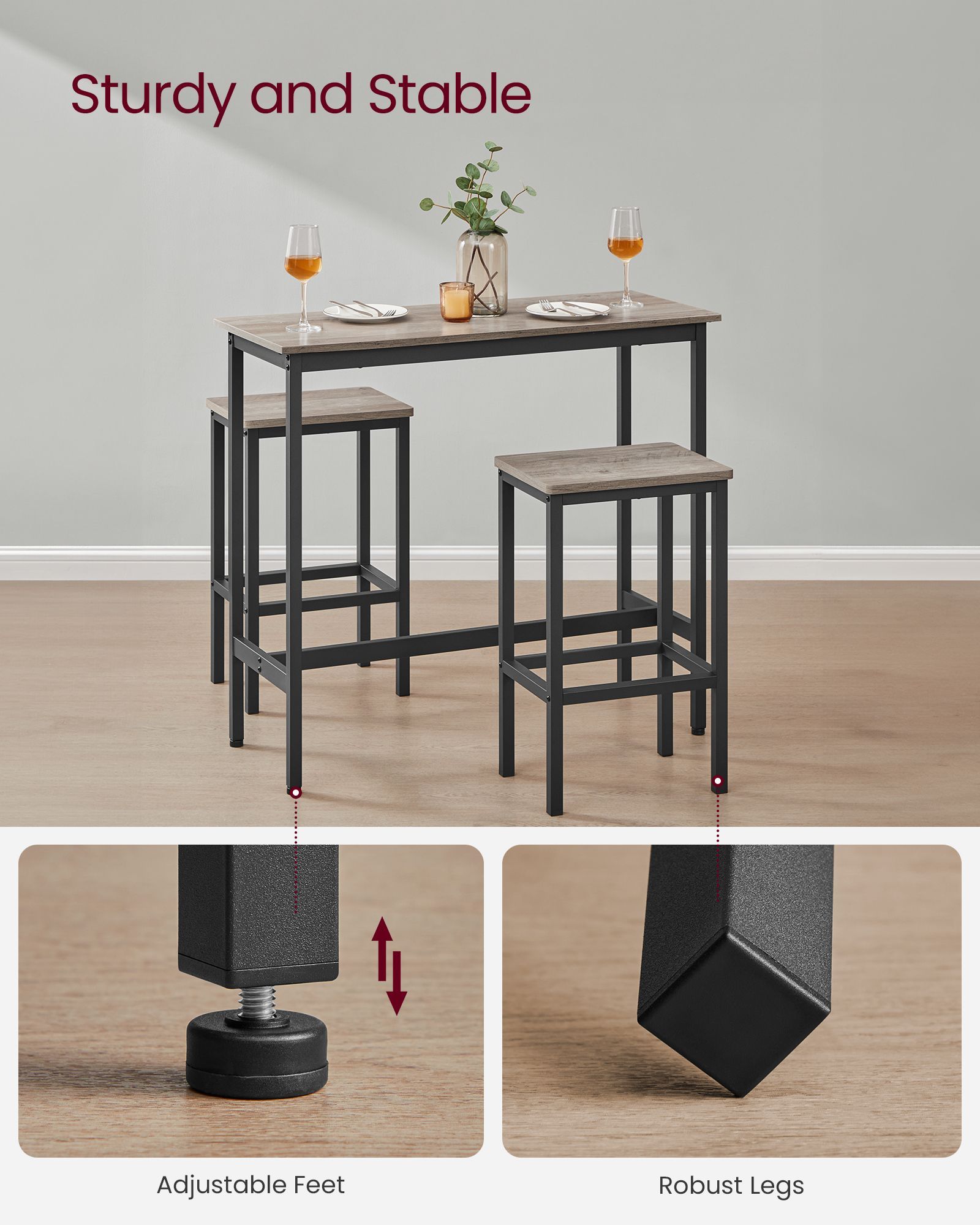 Elevate your dining experience with the VASAGLE Heather Greige and Ink Black Dining Table Set. This stylish set, featuring a breakfast bar table and two stools, boasts an industrial design with a rustic brown and black finish. Its sturdy steel frame ensures durability, making it perfect for intimate meals or casual gatherings.