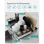 This expandable stainless steel dish drainer rack in silver and ink black is your ultimate kitchen companion. Its rotatable spout directs water efficiently, keeping your countertops dry. With dedicated holders for utensils, cups, glasses, cutting boards, and pans, it offers versatile drying and organization for all your kitchenware.