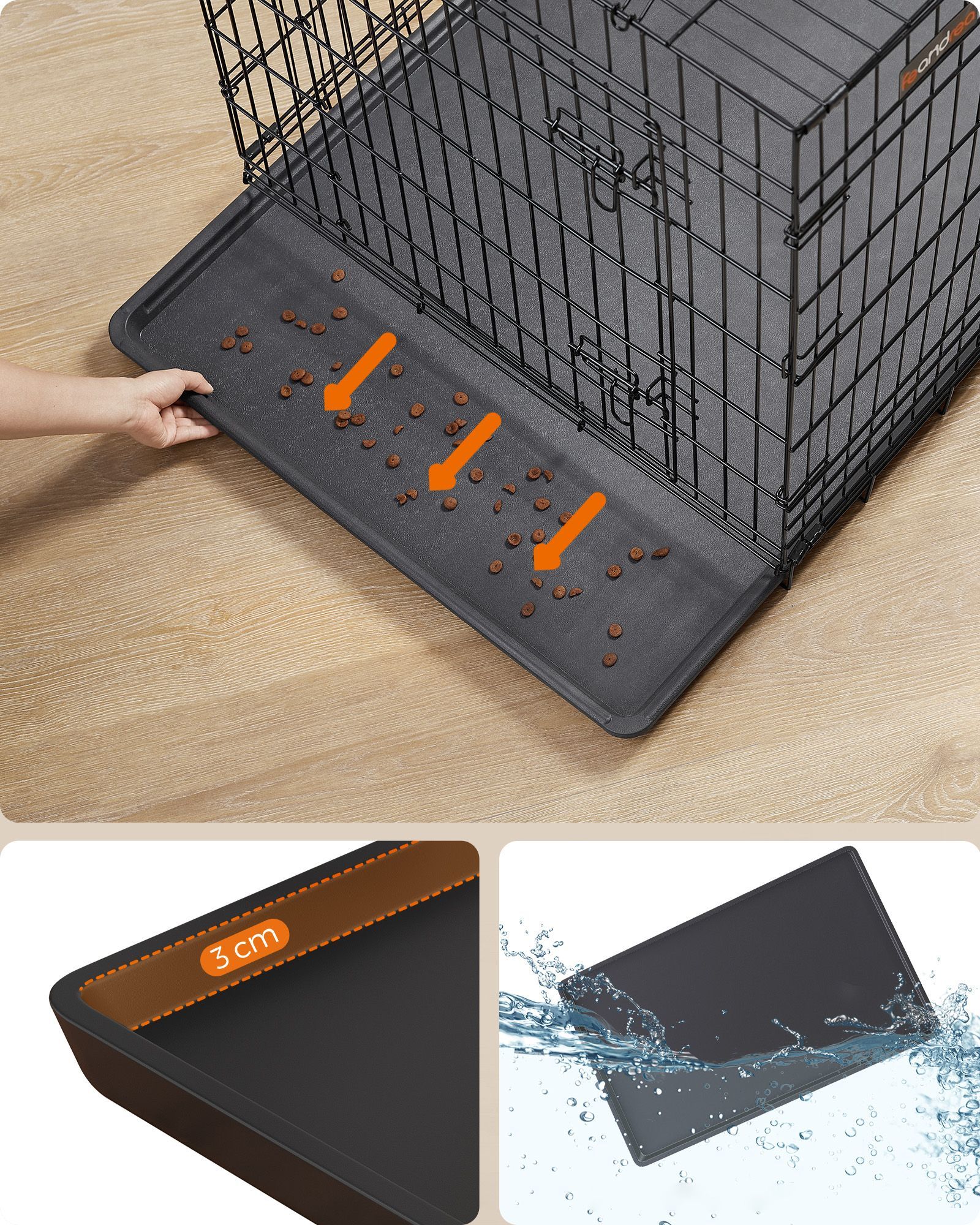 This FEANDREA Foldable Dog Crate in Ink Black (XXXL) provides a secure and convenient space for your pet. Featuring two doors for easy access and a removable tray for simple cleaning, this metal pet carrier is perfect for training, travel, or everyday use. Its foldable design ensures effortless storage and portability.