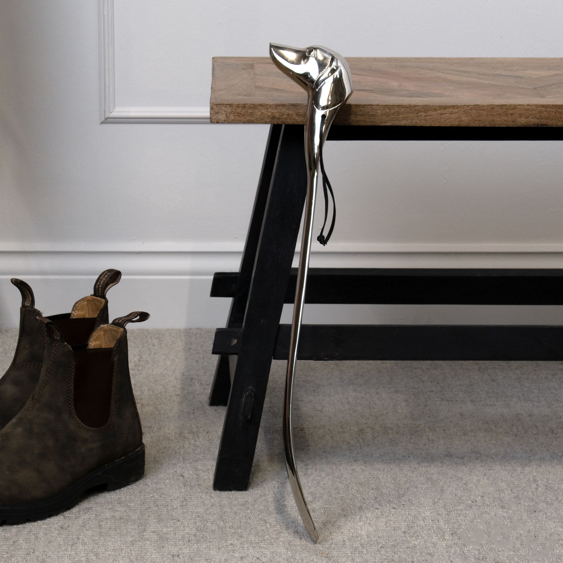 The Dog Head Shoe Horn is a handy addition to any interior whilst also looking great too. It features a simple dog head design which leads into the sleek shoe horn and has been finished in a silver nickel to give a timeless look that will fit into many interior decor schemes. Be sure to take a look at 20083 and 20084 for the horse and stag head versions. A functional yet stylish piece that will elevate any entryway with its elegant silver finish and distinctive dog's head design.