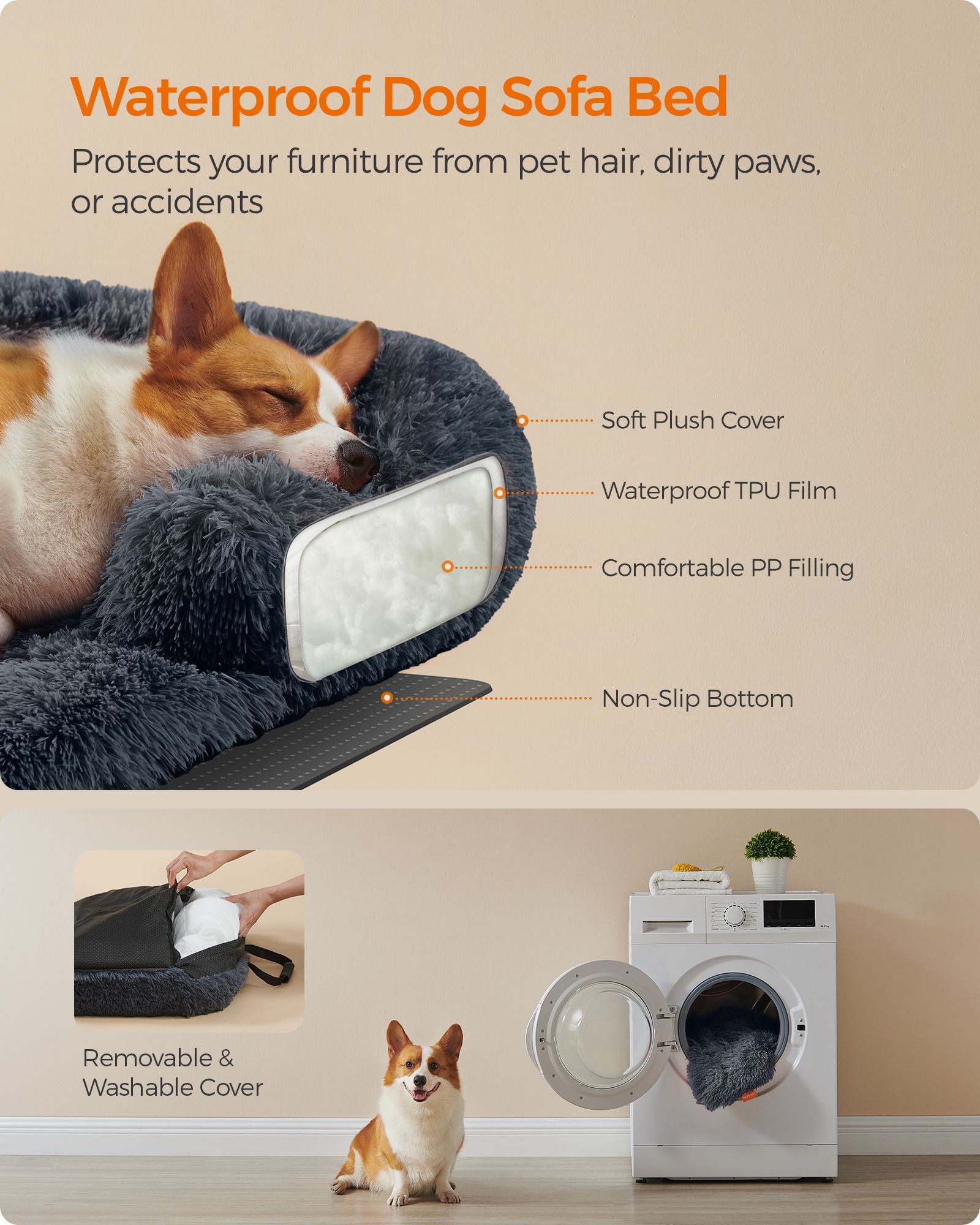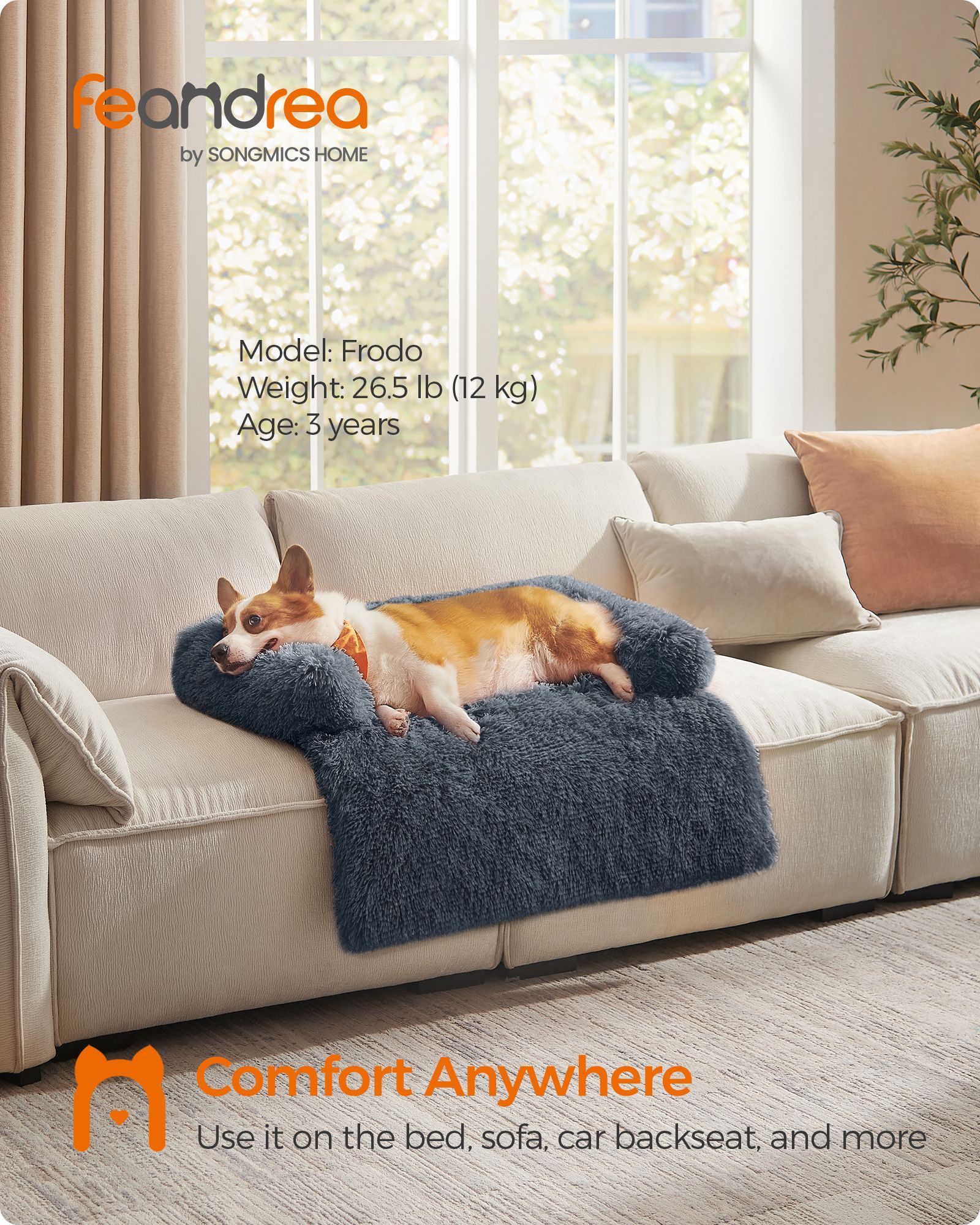 Dog Sofa Bed - MONRA FluffyHug Large Faux Fur Bolster Bed - Dark Grey