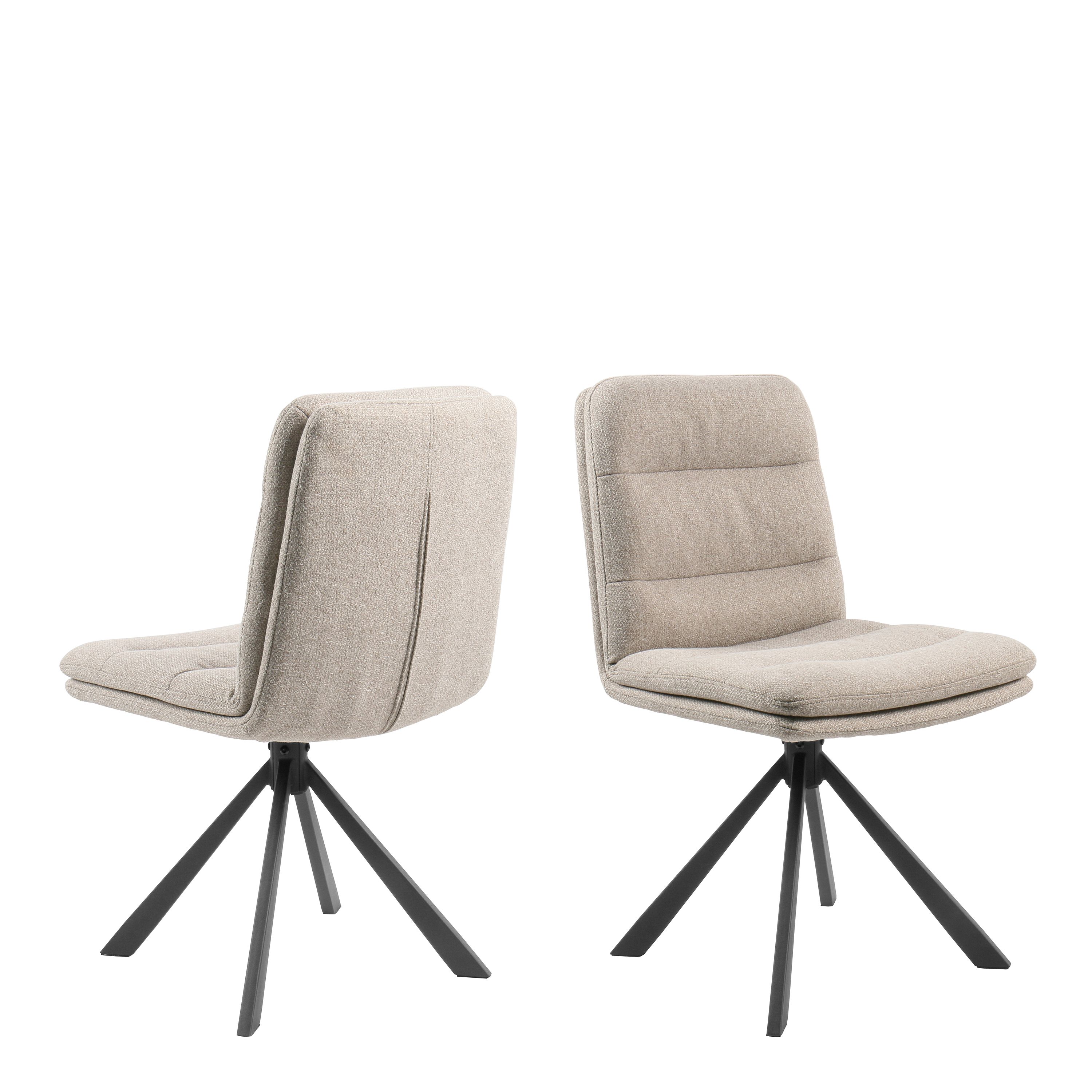 The DOSA dining chair combines sleek design with comfort, featuring a beige Alea fabric upholstery with horizontal stitching for a sophisticated look. The chair is equipped with a swivel function for easy movement and is supported by a sturdy black 4-star base made of matt black rough powder-coated steel. Sold in a set of two, this chair offers both style and functionality, making it a perfect addition to modern dining spaces.