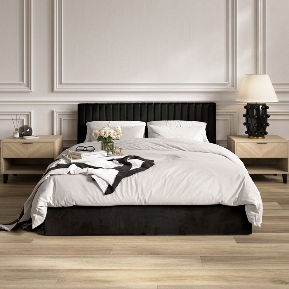 Upholstered in soft black velvet, this bed features under-bed storage and a headboard with elegant fluted vertical lines. Available in two headboard heights, its neutral colourway complements any interior.