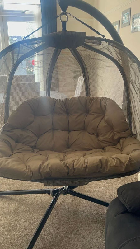 Make the most of lazy days with this double seat hanging egg chair from. This large outdoor/indoor chair is made from breathable texteline, fitted with a removable seat basket to hold your body in place. There's a large padded cushion to keep you comfortable. Made from steel, the frame is strong and holds the sitting basket securely in place. Three long legs for balance. Easy to store, thanks to the foldable seat basket.